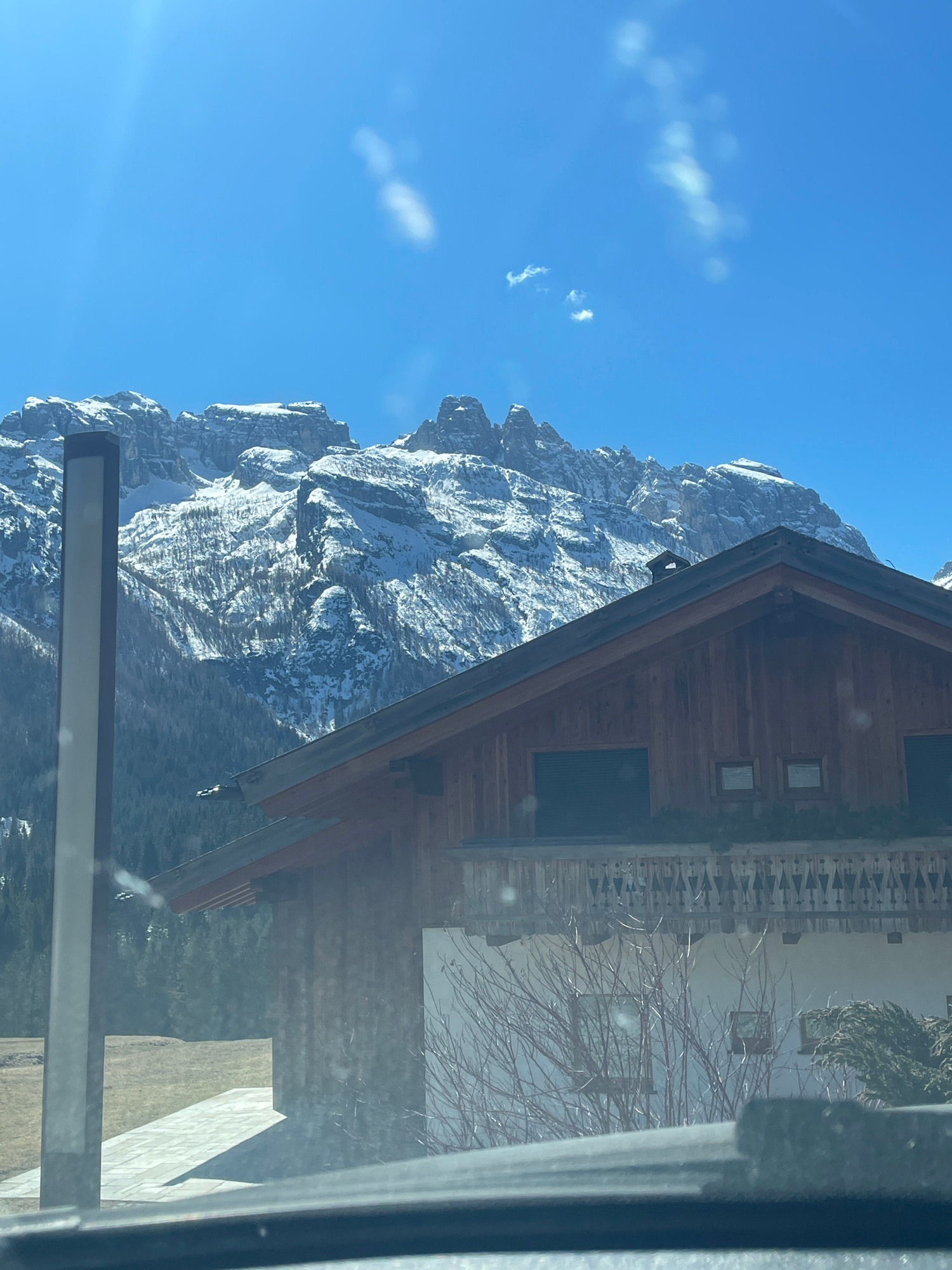 A landscape photograph depicts a snow-dusted mountain range against a bright blue sky with sparse clouds. The image is taken from within an interior space, indicated by the presence of building struct…read more