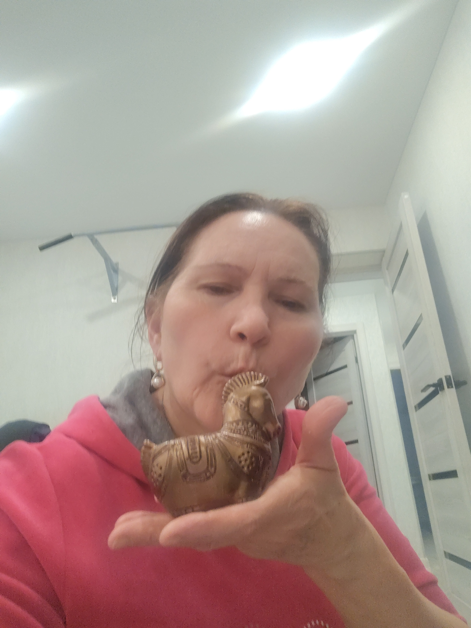 A middle-aged woman wearing a pink hoodie and pearl earrings is indoors, possibly in a residence. She is holding a small, detailed, bronze-colored horse figurine in her left hand, which is positioned…read more
