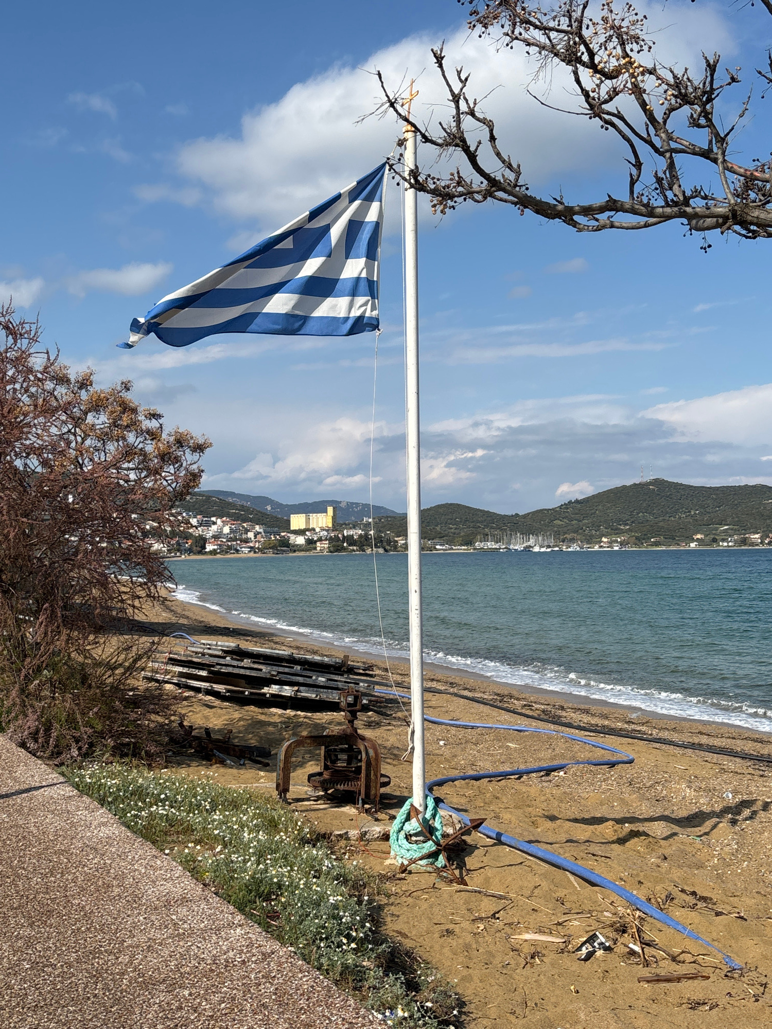The image captures a scene in Nea Peramos, Greece, featuring a Greek flag prominently displayed in the foreground against a backdrop of a beach and the town. The flag is mounted on a white pole, posit…read more