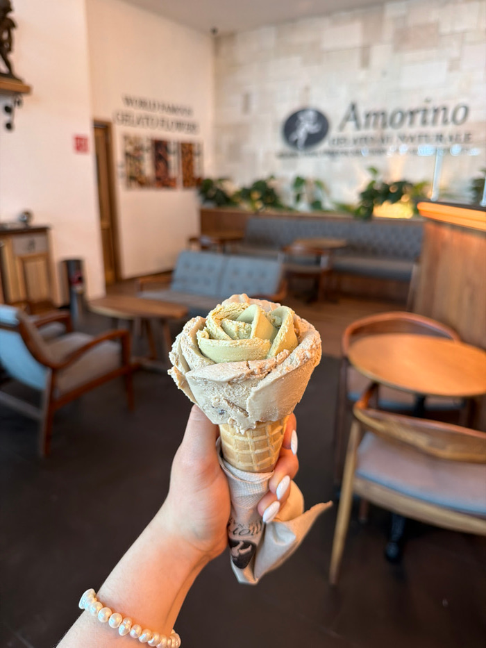 A first-person perspective photograph captures a human left hand holding a rose-shaped ice cream cone inside an Amorino gelato shop located in Veracruz, Mexico. The ice cream features two distinct fla…read more