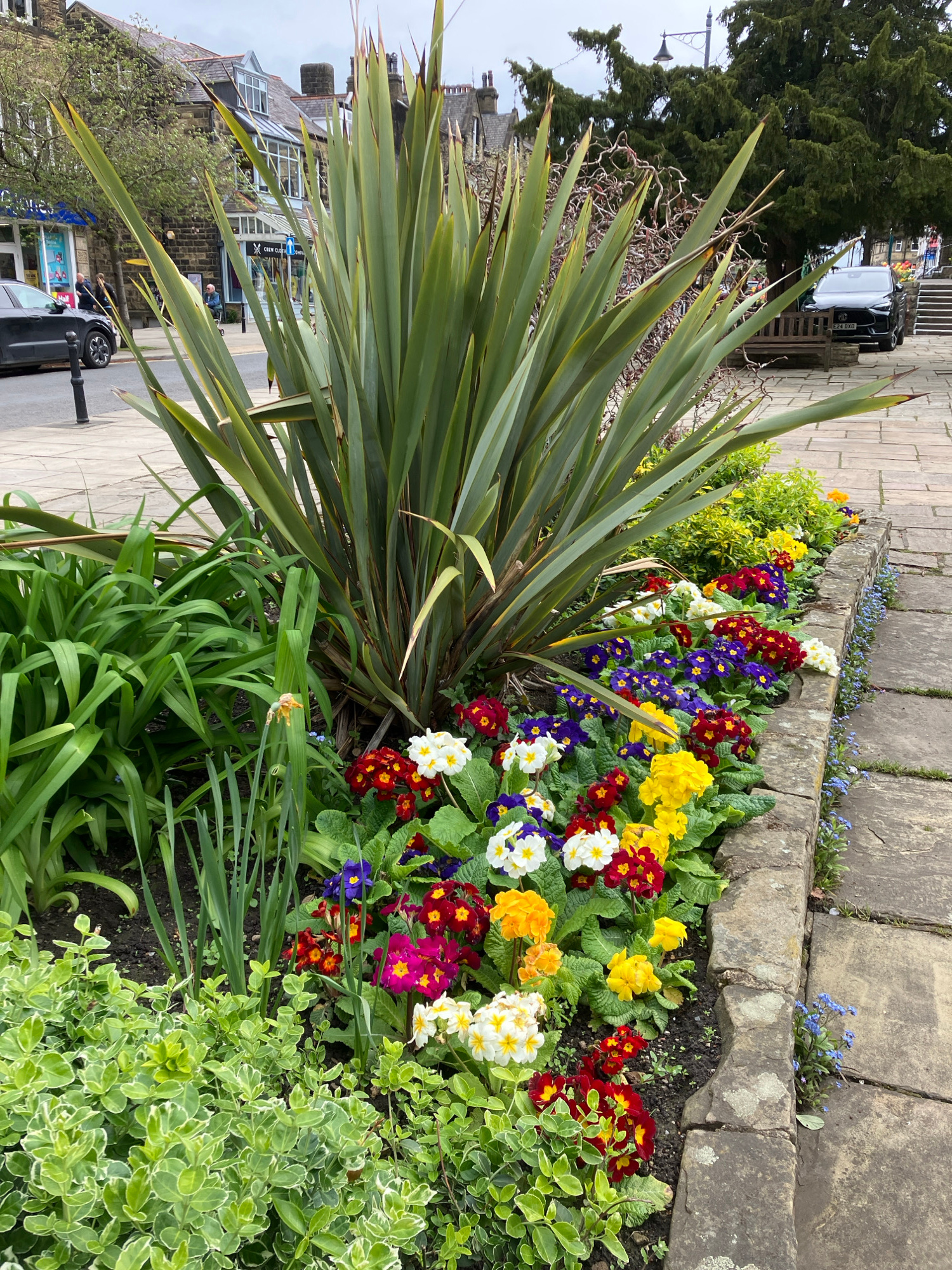 This vibrant image captures a flower bed alongside a paved walkway in what appears to be a town or urban setting in Bradford, United Kingdom. The scene is illuminated by the soft, even light of an ove…read more