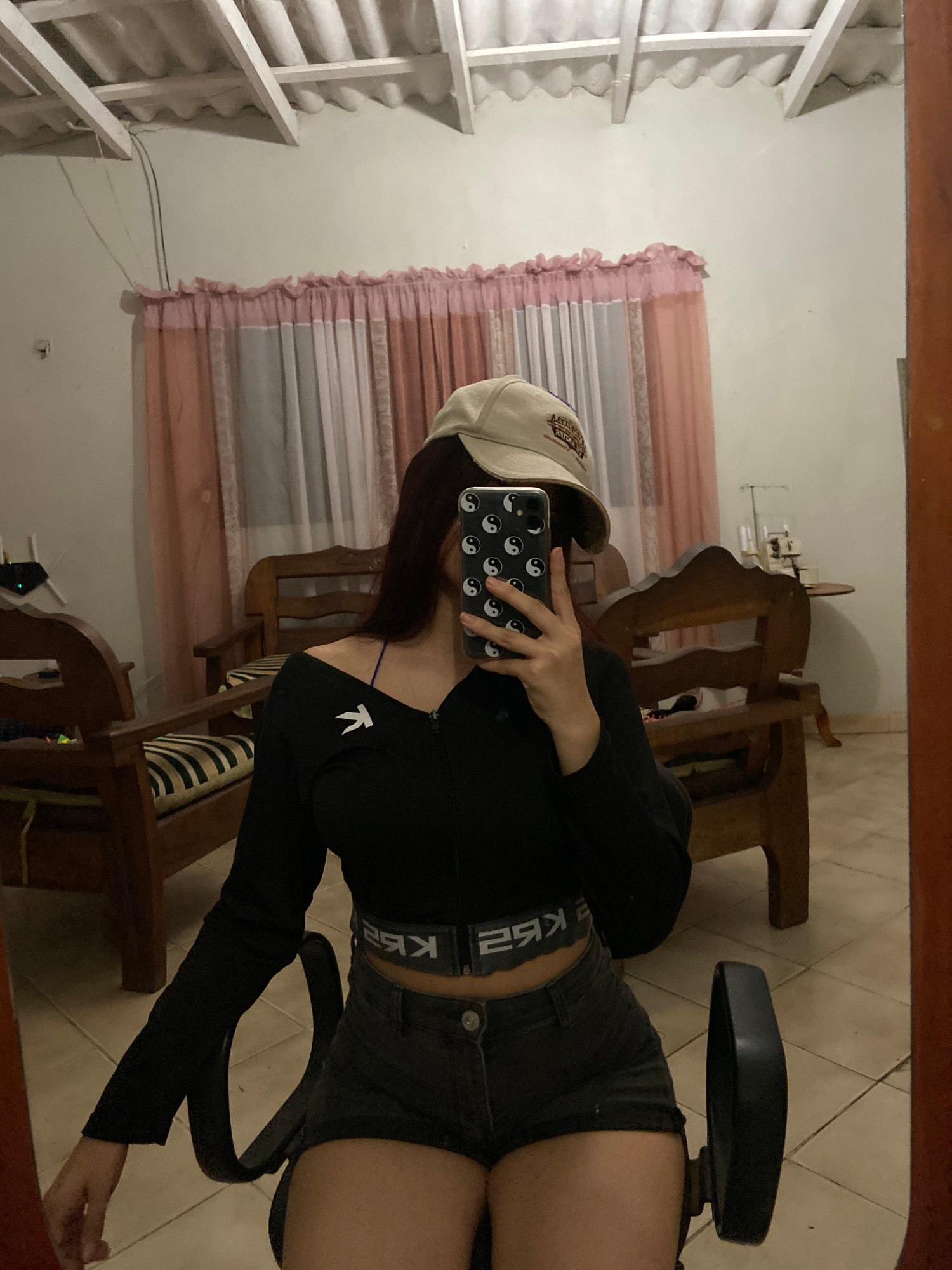 The image shows a person taking a selfie in a mirror. The person is wearing a beige baseball cap, a black long-sleeved top with a small white logo on the left shoulder, dark denim shorts, and a black…read more