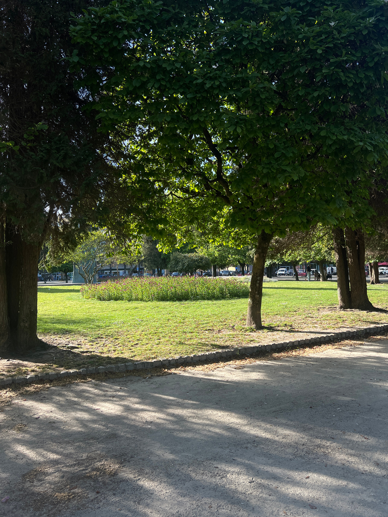The image shows a view along a pathway in a cemetery. A grassy area with trees lines the path on one side, with headstones visible further in. The path is unpaved, and shadows of trees are cast upon i…read more