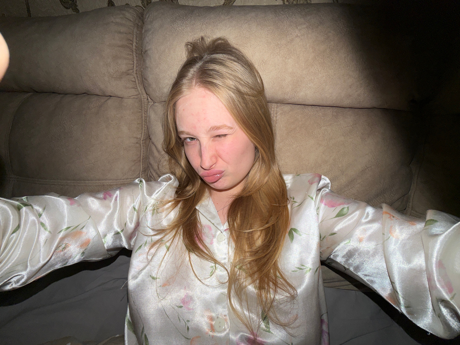 A female with fair skin, blonde hair, and wearing a floral-patterned satin pajama top lies on a beige fabric couch. She is positioned with her head at the bottom of the frame and winking her left eye.…read more