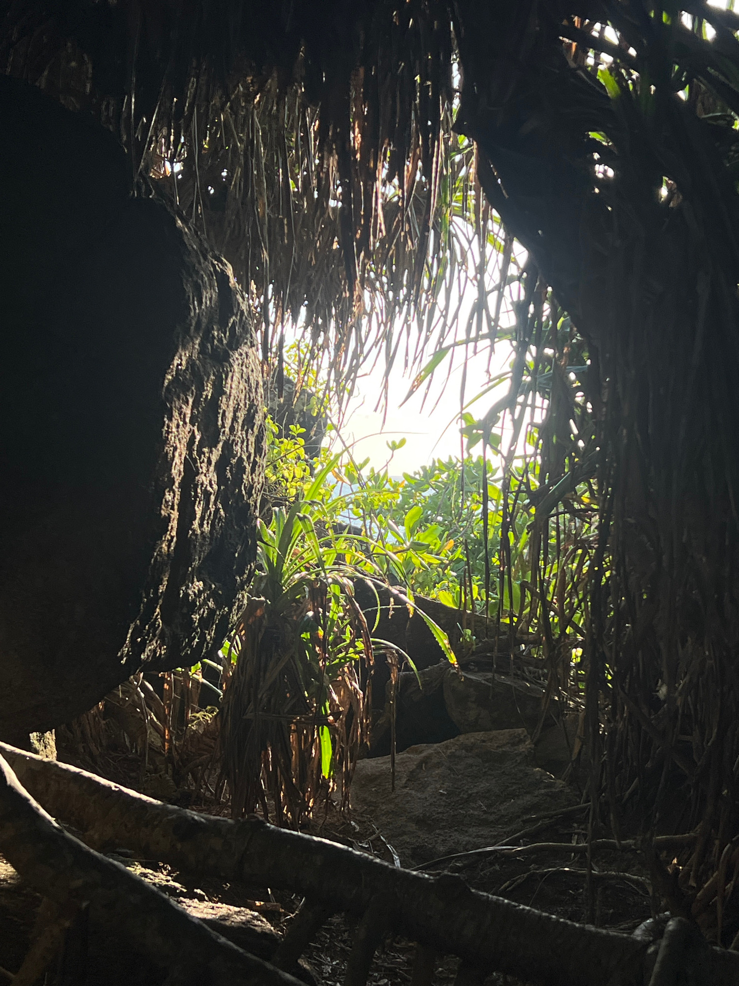 The image displays a view from a dark, sheltered natural cavity or overhang in Goviyapana, Sri Lanka, looking out into a brightly sunlit vegetated area. The left foreground is dominated by a massive,…read more