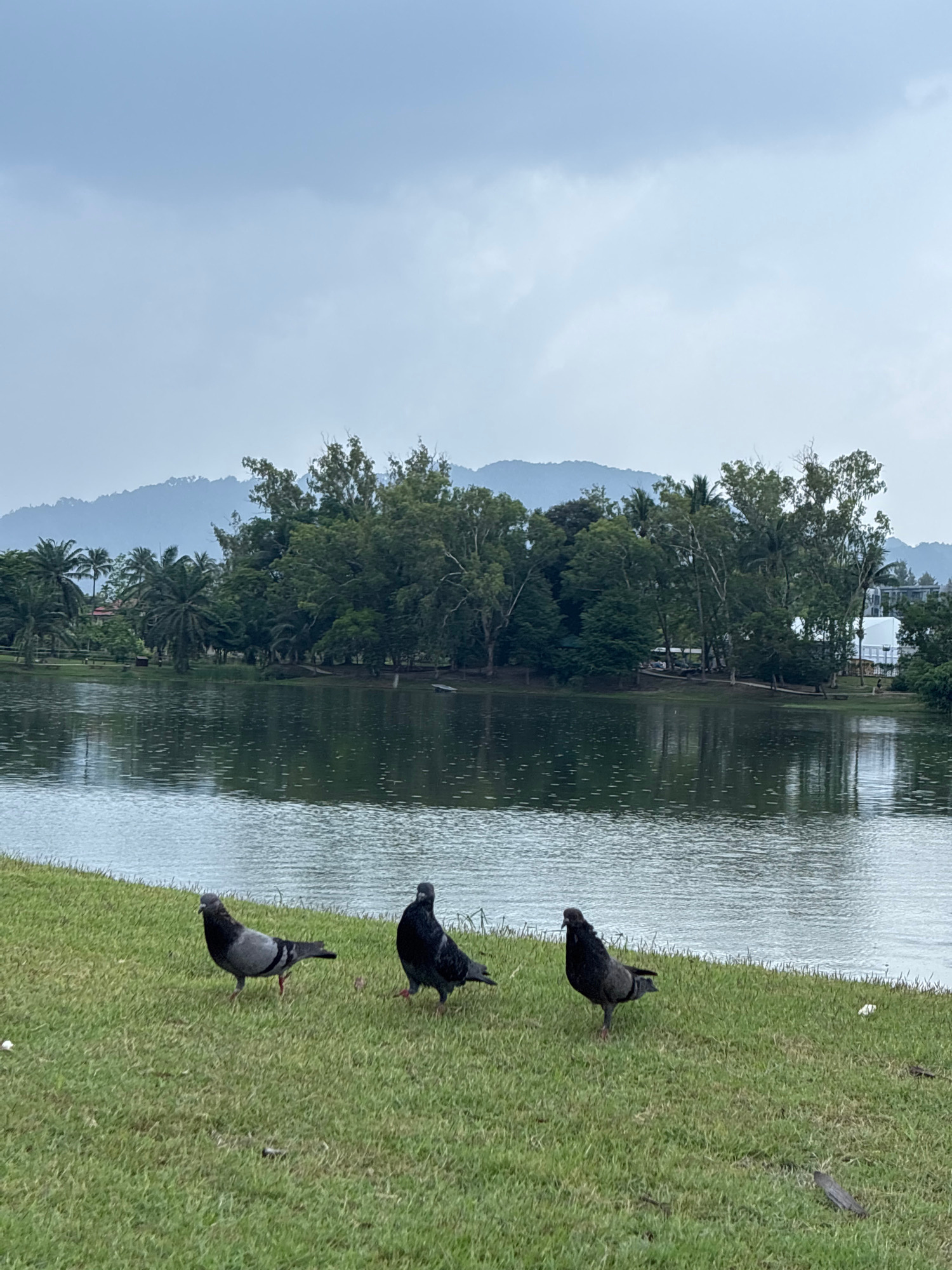 The photograph depicts a lakeside scene in Choeng Thale, Thailand. Three pigeons are foraging on a grassy bank that slopes down to the water's edge. The lake's surface reflects the surrounding trees a…read more