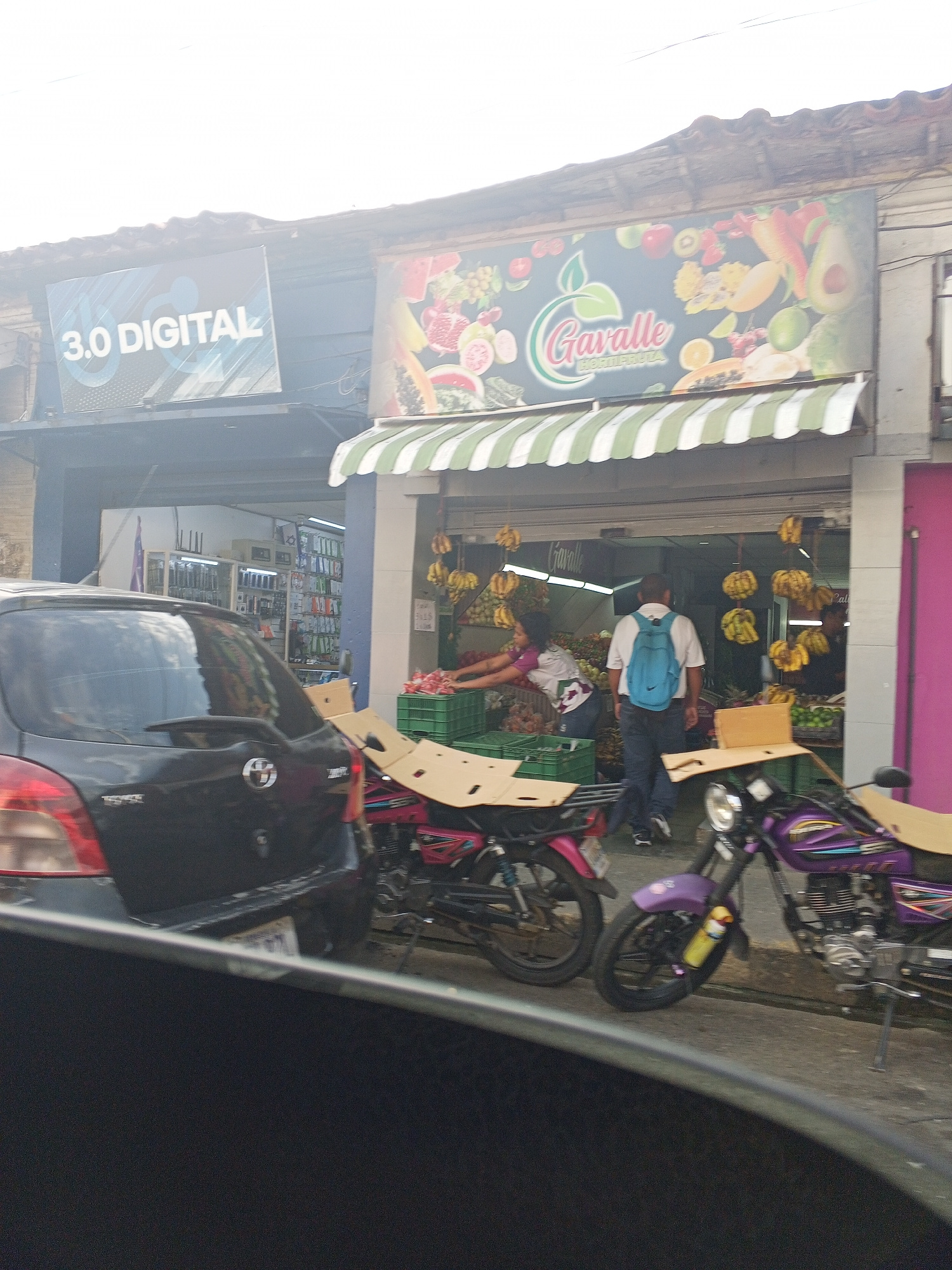 The image depicts a street scene in Tinaquillo, Venezuela. A black Toyota Yaris is parked on the left, obscuring part of the view. Next to the car, two motorcycles with purple and pink detailing are p…read more