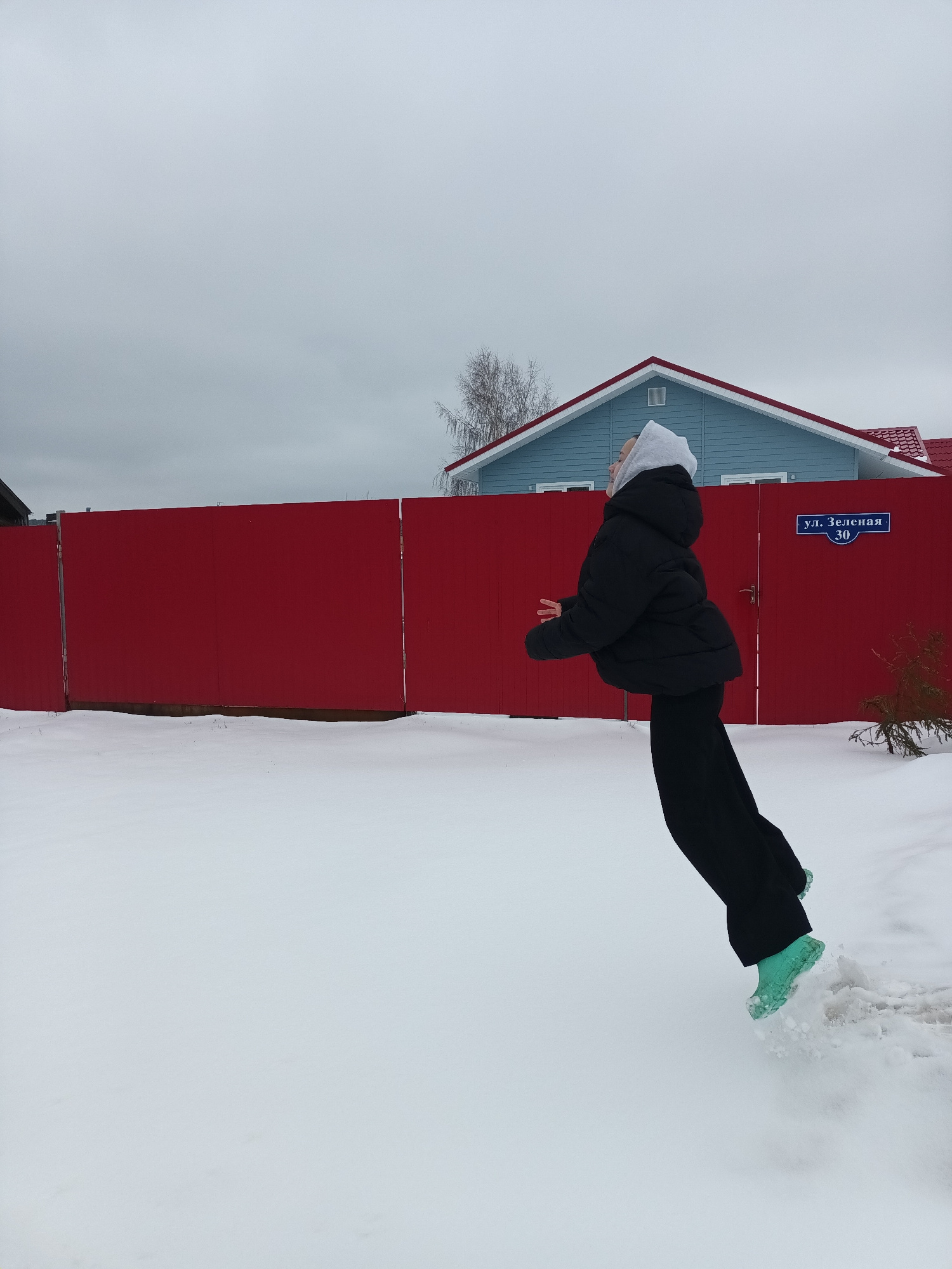 A young person in a black coat and black pants is posed in front of a red building with a blue upper section, standing in snow in Ольховка, Russia. The person is wearing light green boots and has a ho…read more