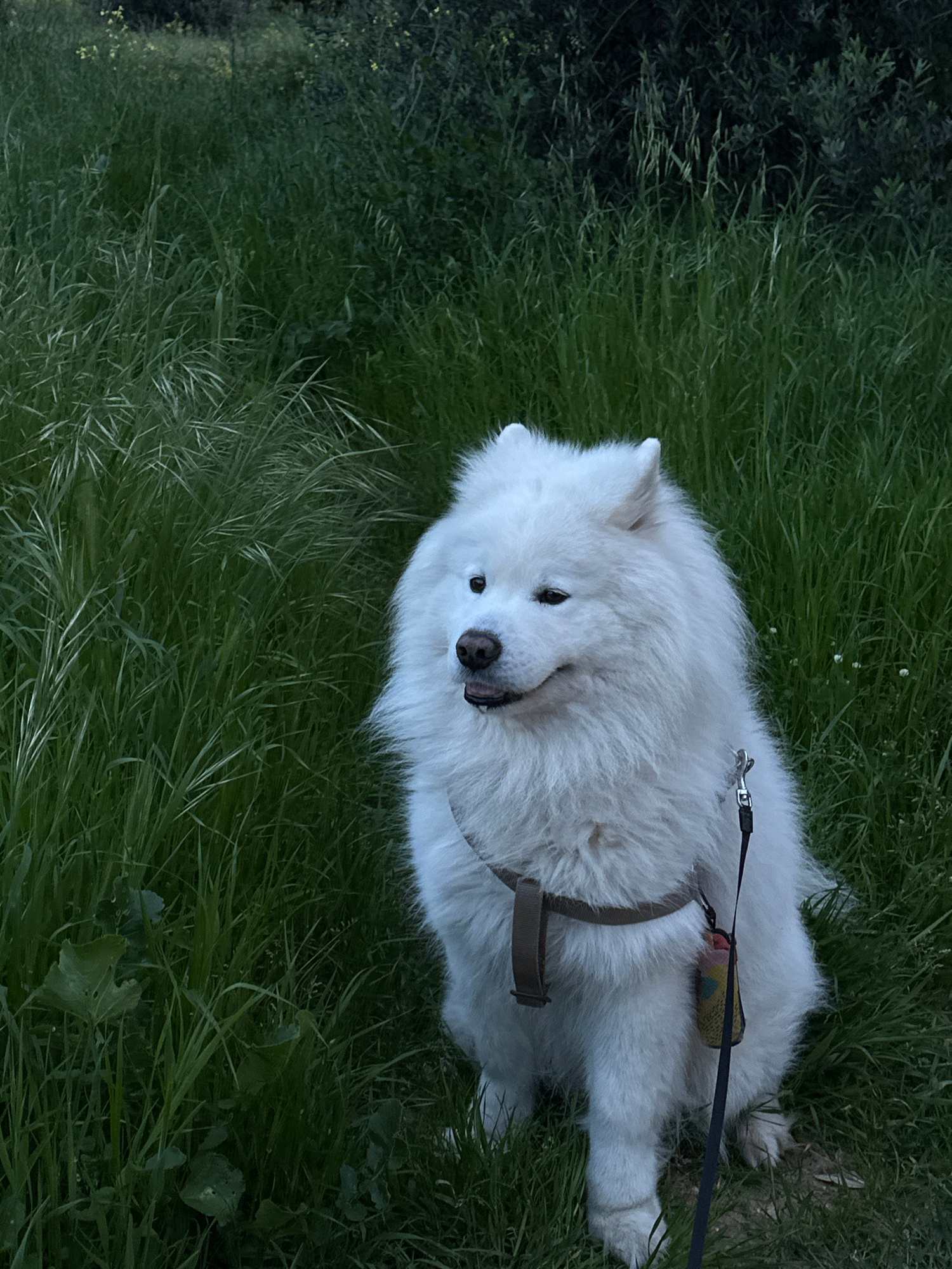 A white Samoyed dog is lying down in green grass, wearing a brown harness. The dog has a black leash attached to the harness, and a colorful toy is clipped to the leash. The grass is lush and slightly…read more
