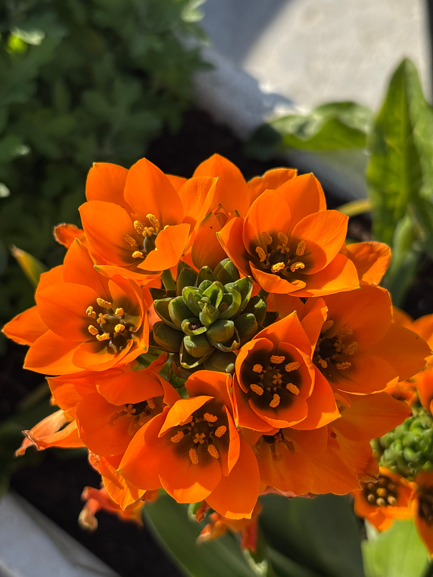 A close-up, high-angle photograph shows a cluster of orange Ornithogalum dubium flowers in full bloom. The flowers feature bright orange petals surrounding a dark brown center, with yellow pollen. The…read more