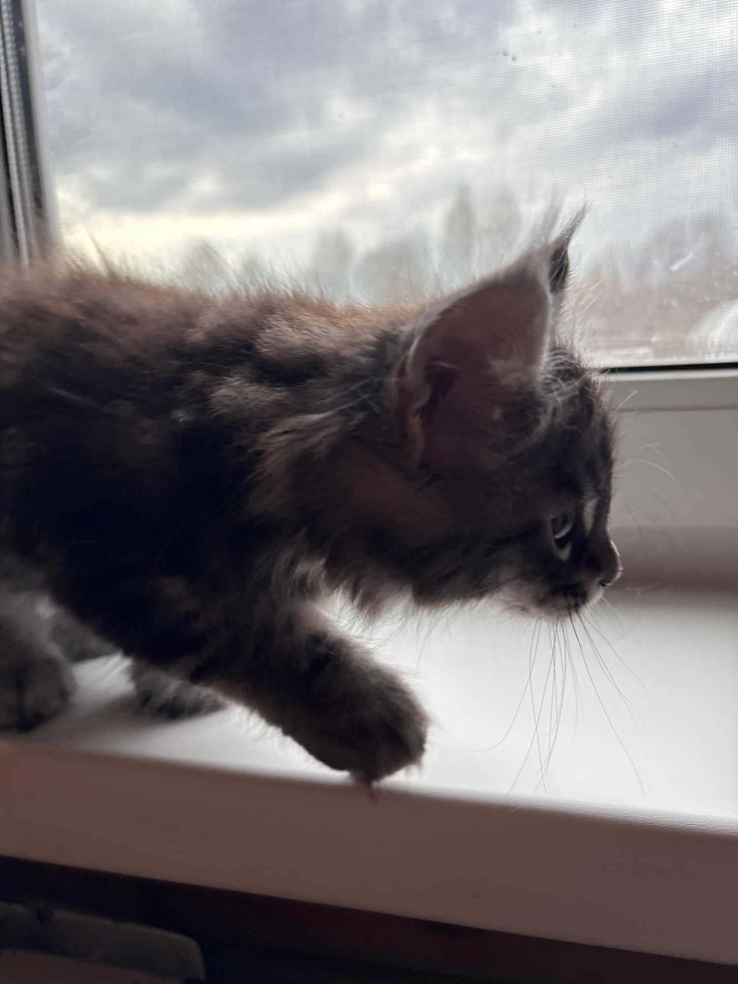 A close-up shot shows a gray, fluffy kitten with its front paw raised against a window frame. The kitten's head is tilted upwards, and its whiskers are visible. Through the window screen, blurred clou…read more