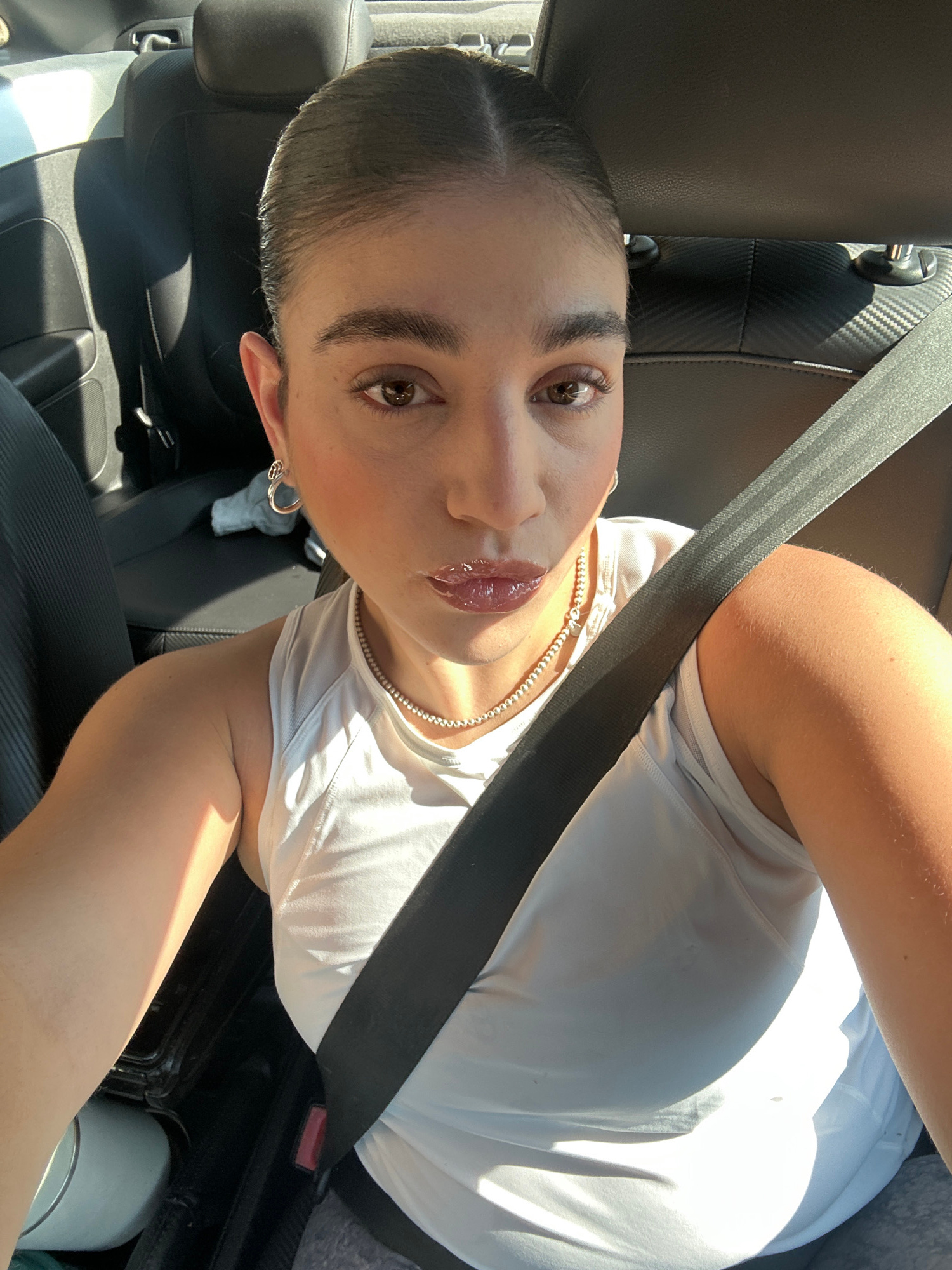 A woman is in the passenger seat of a car. She is wearing a white top and a silver necklace, and has on a seatbelt. Her hair is slicked back. The interior of the car is black leather. There is a water…read more