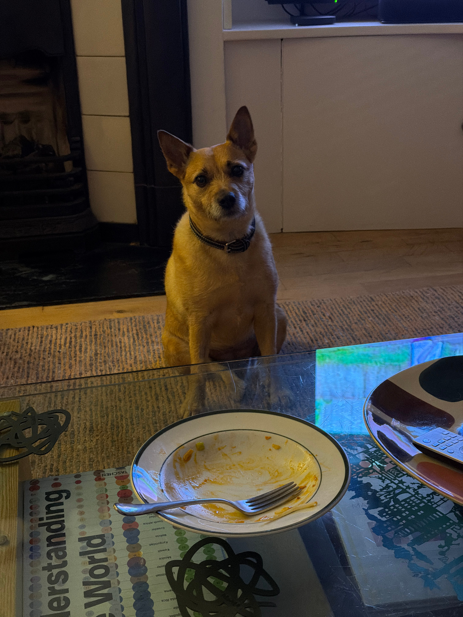 A medium-sized, tan-colored dog with a black collar is positioned next to a glass-topped table. The dog is looking towards the camera. On the table, there is a half-eaten plate of food with a fork on…read more
