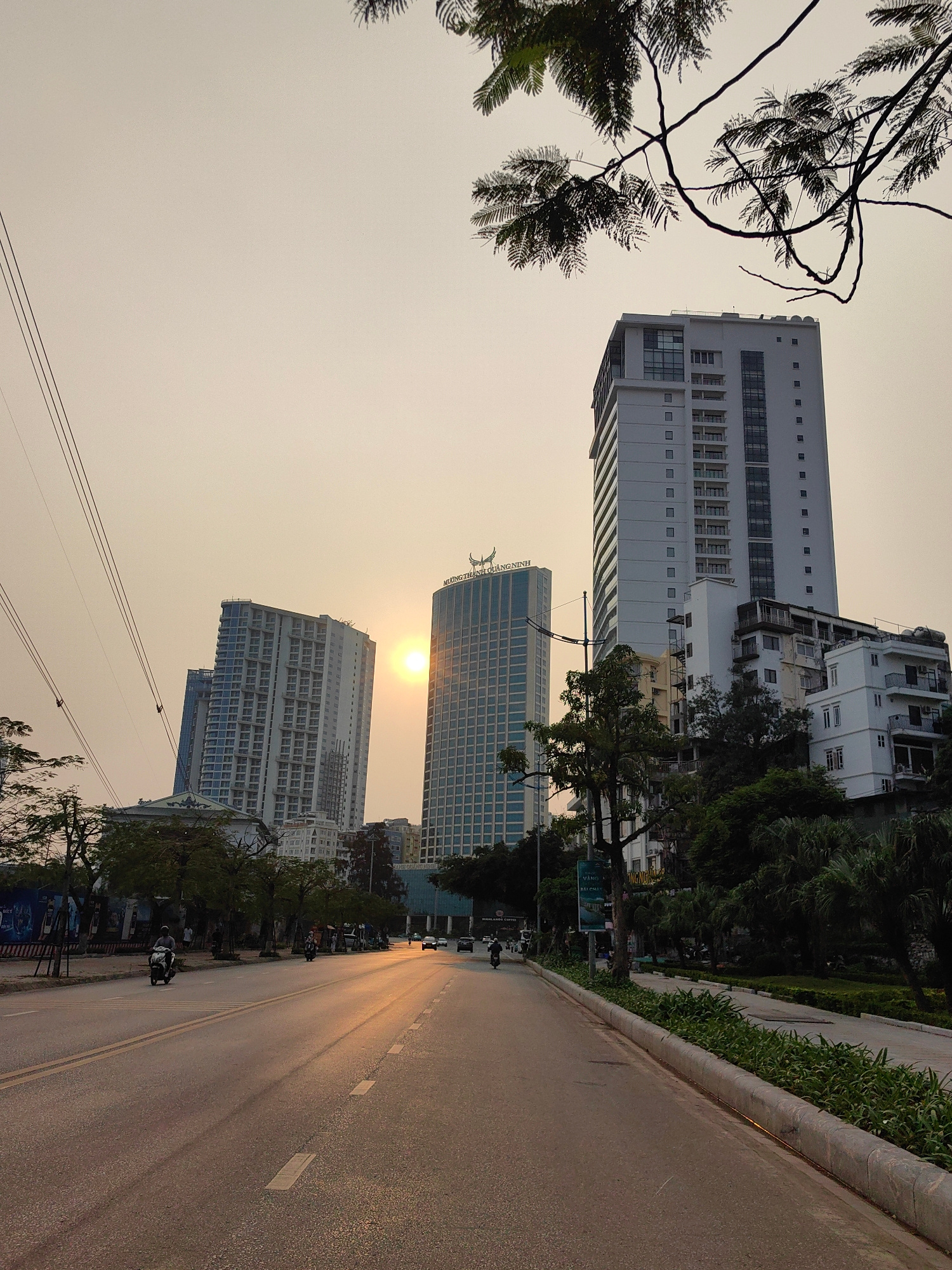 The image depicts a street in Bai Chay Ward, Vietnam at sunset. The street is asphalt and features double yellow lines with a concrete curb on the right. Tall buildings, including the Muong Thanh Quan…read more
