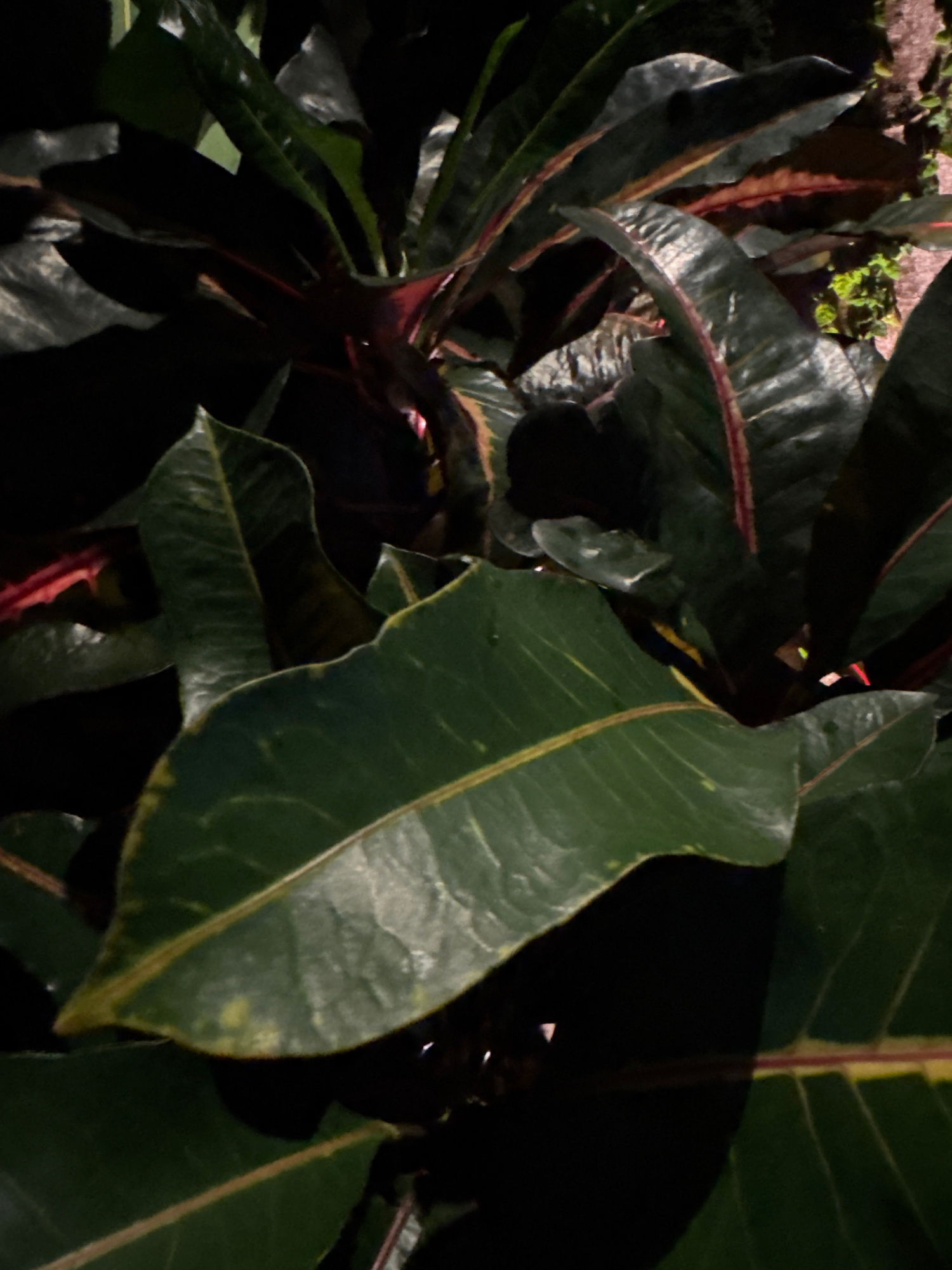 The image shows a close-up of croton plant leaves. Some leaves are dark green with red veins, while others are green with yellow veins. The scene appears to be dimly lit, with some areas obscured by s…read more