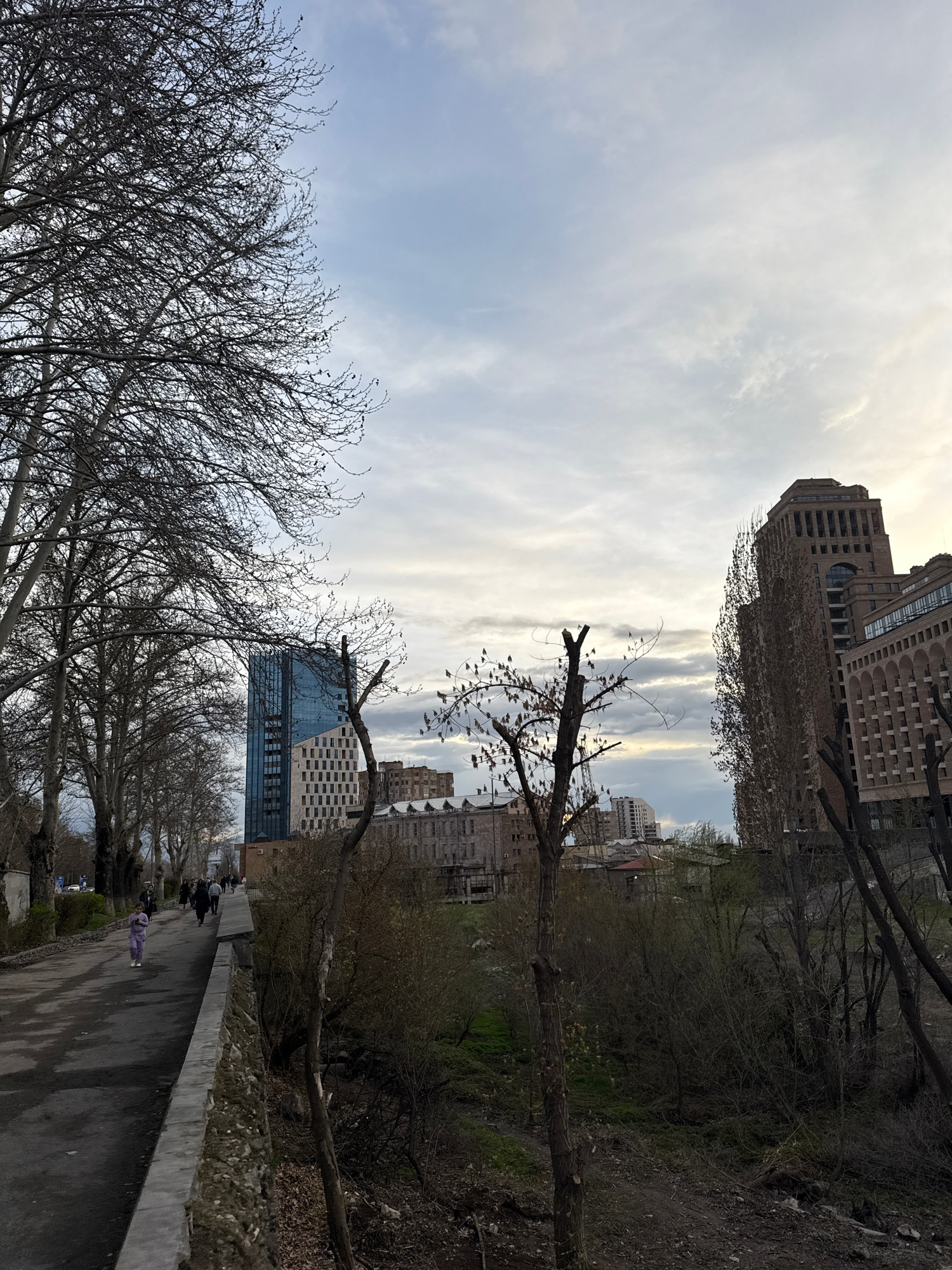 The image depicts a view of Yerevan, Armenia, likely from a park or elevated walkway. Tall buildings are visible in the background and among the trees. The sky is overcast with wispy clouds. Several b…read more