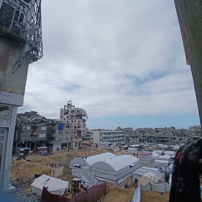 The image displays a panoramic view of a heavily damaged urban environment in the city of Gaza, Palestinian Territory, under a partly cloudy sky. The scene is characterized by numerous multi-story bui…read more