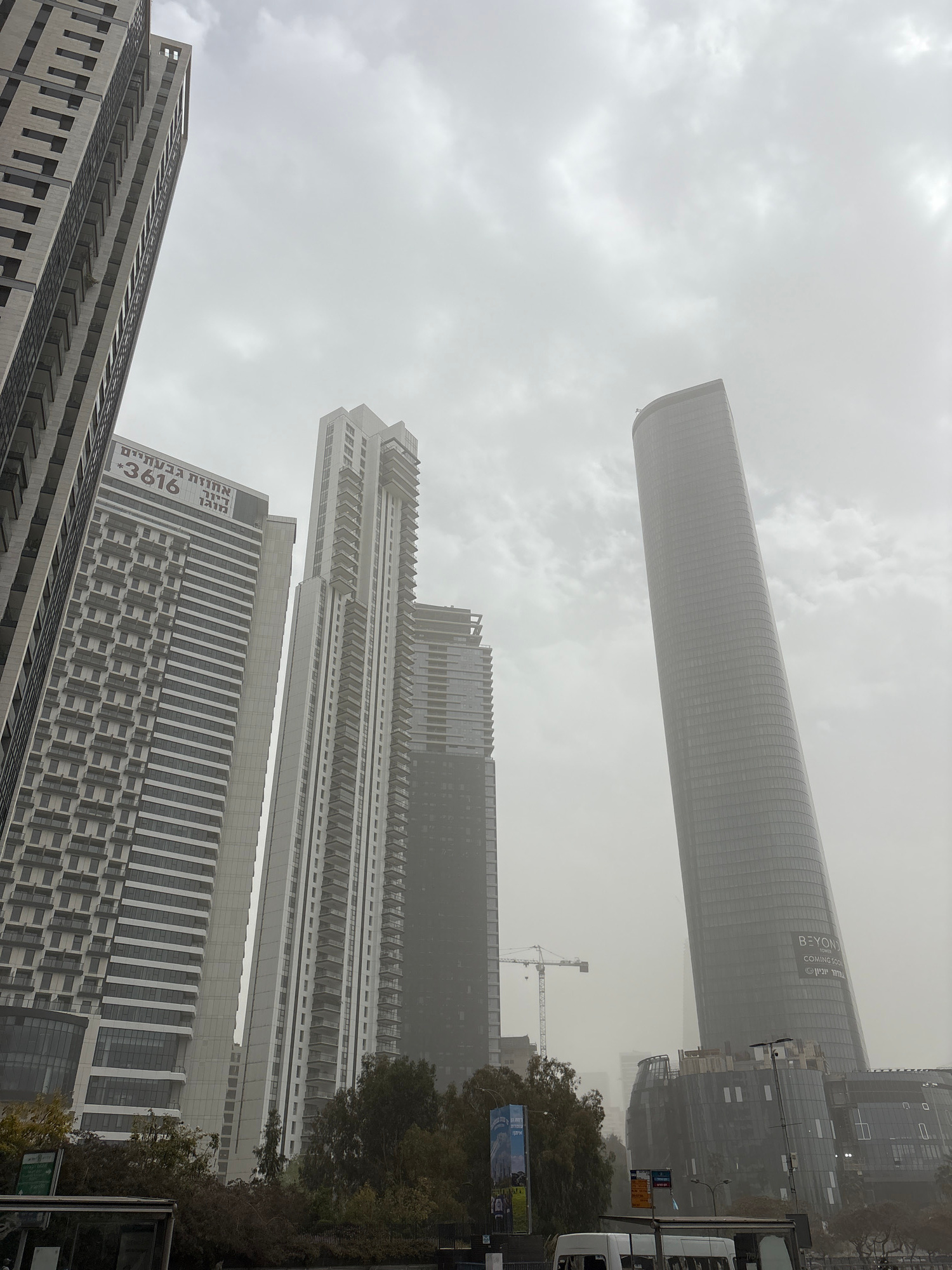 The image displays a dense urban landscape in Ramat Gan, Israel, under a heavily overcast and hazy sky. The low-angle perspective looks up at multiple towering modern buildings, creating an impression…read more