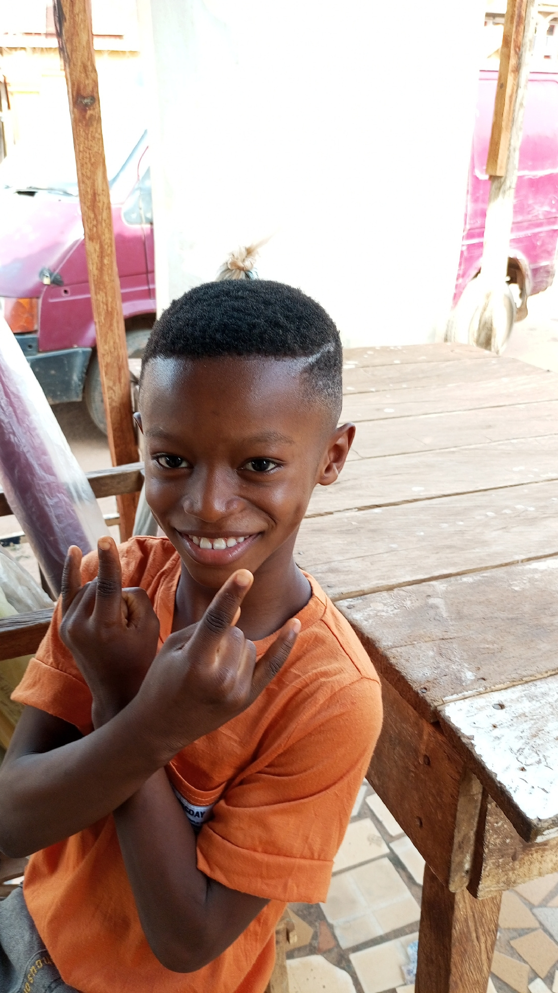 A young Black boy, approximately 8-12 years old, is depicted smiling broadly at the camera, showcasing dimples on his cheeks. He has a short, dark haircut with a shaved line design visible on the righ…read more