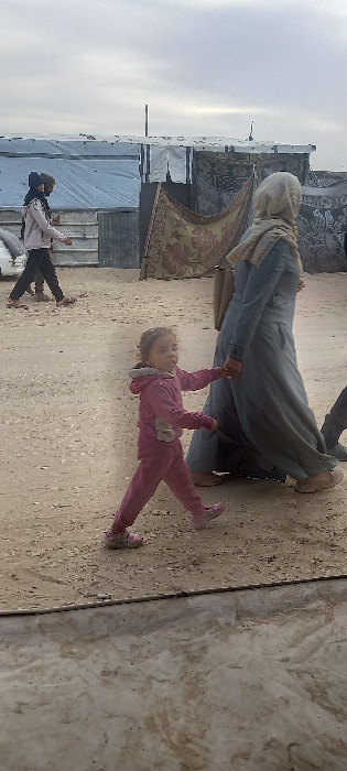 The image depicts a scene in Khan Yunis, Palestinian Territory, featuring four individuals on a dirt path with makeshift shelters in the background under an overcast sky. In the foreground, a young gi…read more