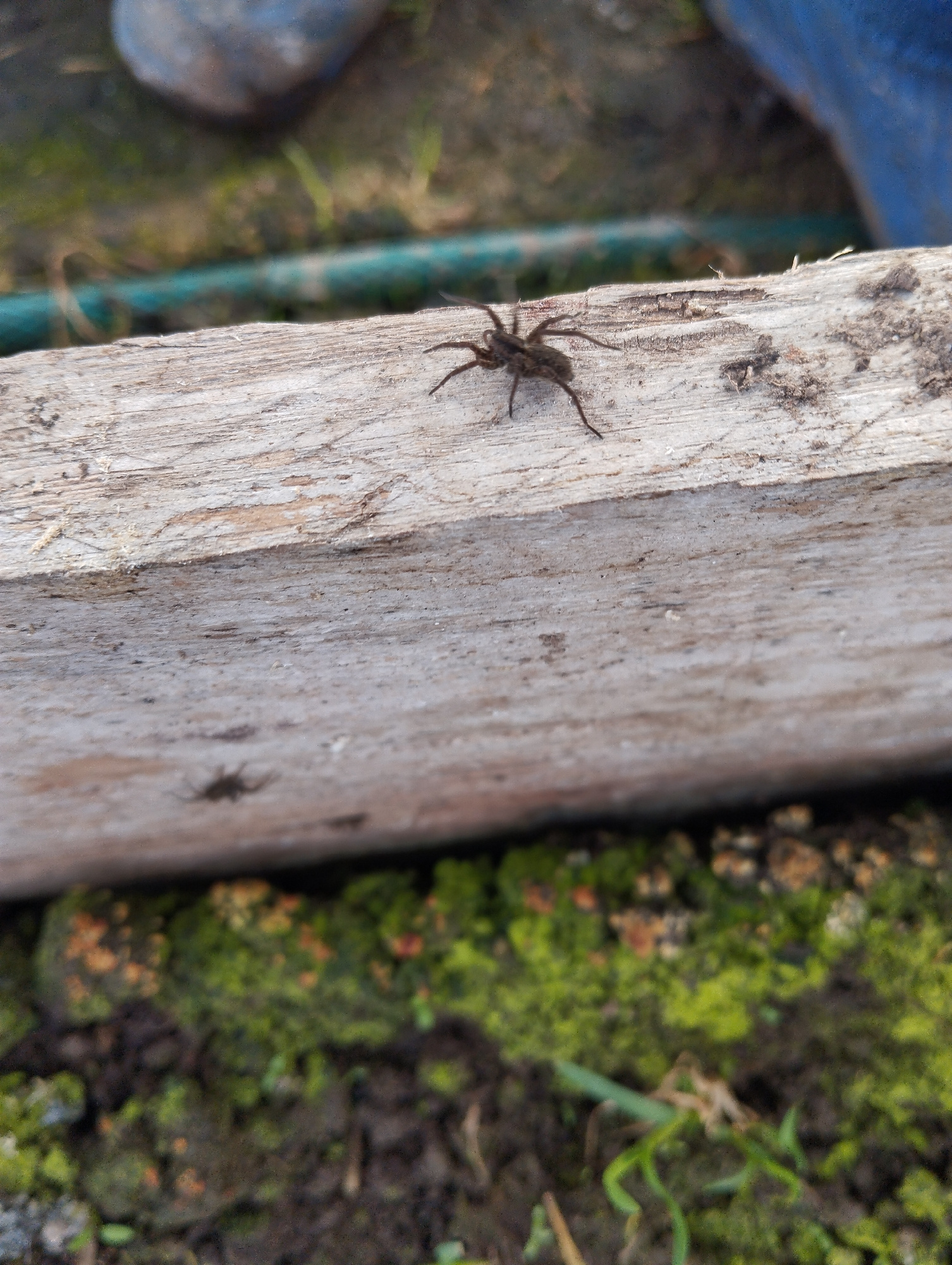 A close-up shot depicts a brown spider with long legs on a weathered, light-colored wooden plank. Below the plank, there's a patch of green moss and soil. A blurry blue object appears in the upper rig…read more