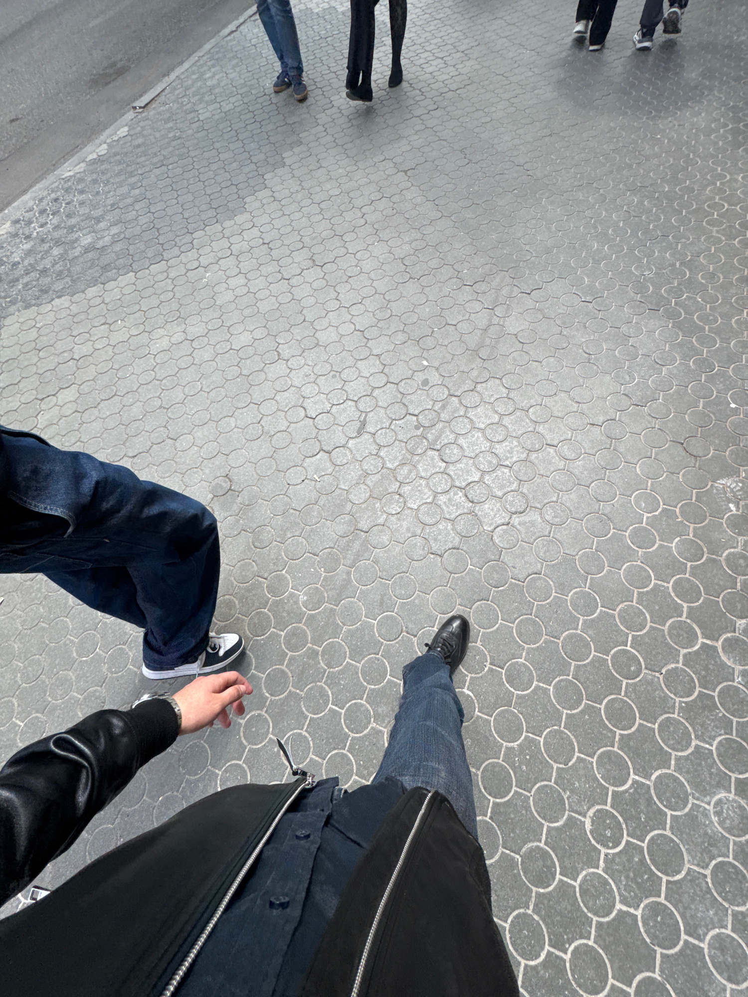 The image depicts an overhead view of a paved area with a distinctive circular pattern in Yerevan, Armenia. Two individuals are partially visible. On the right side of the frame, a person wears jeans…read more