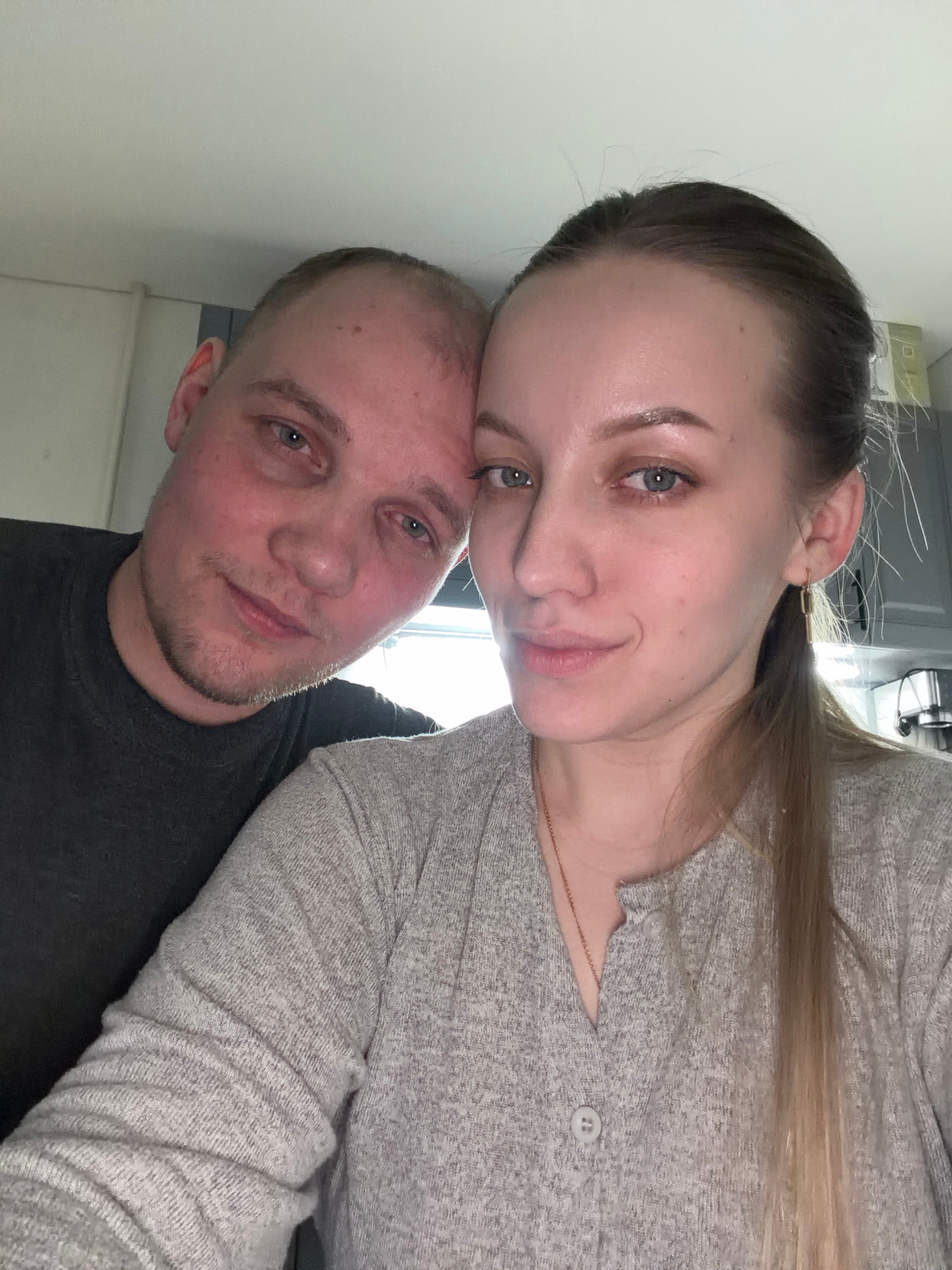 A selfie of a woman and a man. The woman has fair skin, light eyes, and light brown hair pulled back in a ponytail. She is wearing a light grey, button-down shirt. The man has fair skin, light eyes, a…read more