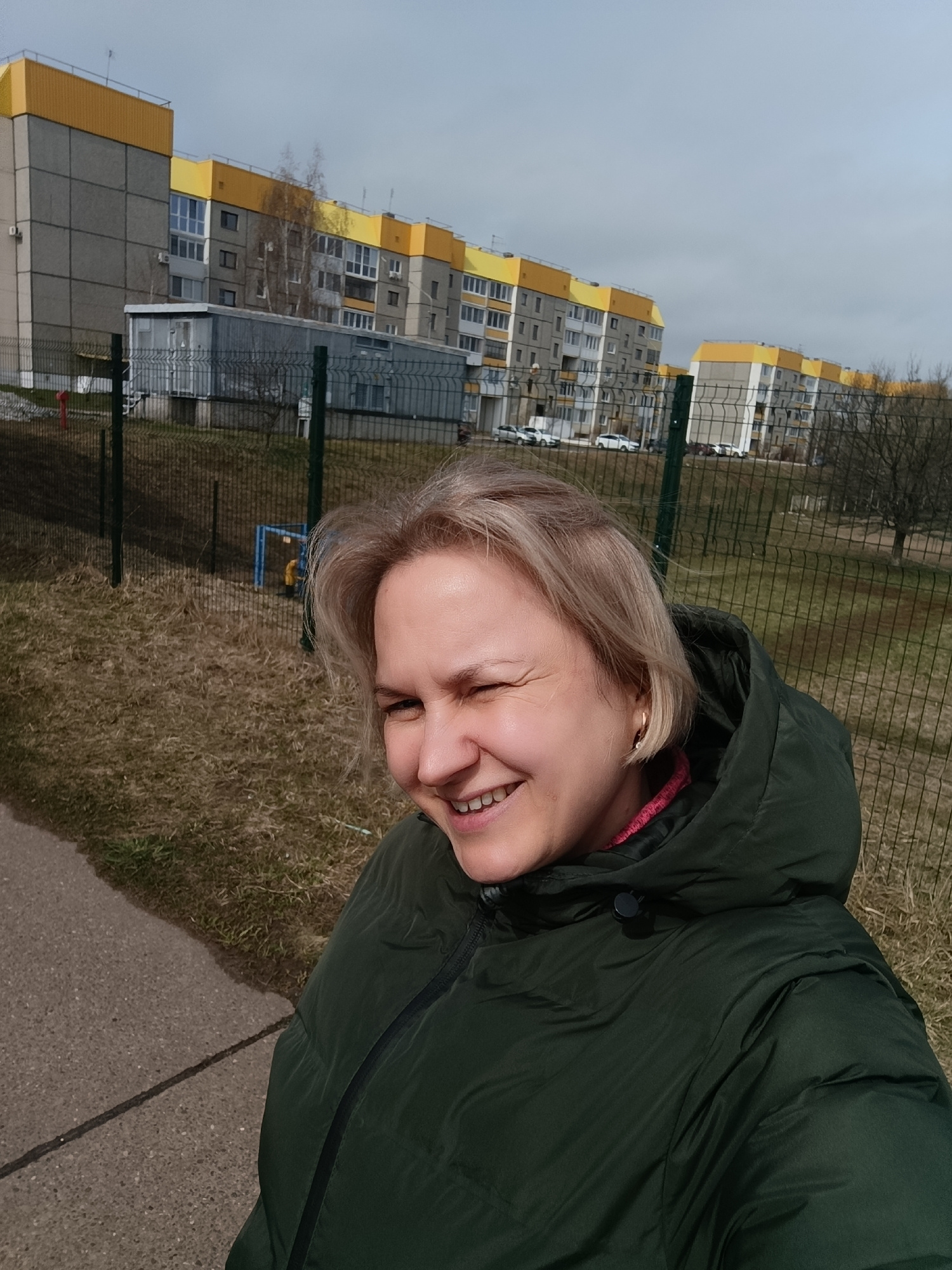 A middle-aged woman with blonde hair is smiling and winking at the camera. She is wearing a dark green puffy jacket. The background shows a row of multi-story apartment buildings with gray and yellow…read more