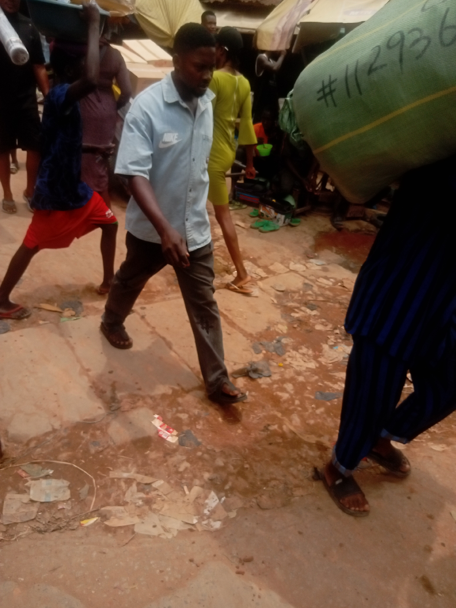 The scene depicts a bustling street market in Fegge, Nigeria. Several individuals are seen navigating the crowded area. A man in a light blue, short-sleeved shirt and dark pants is walking towards the…read more