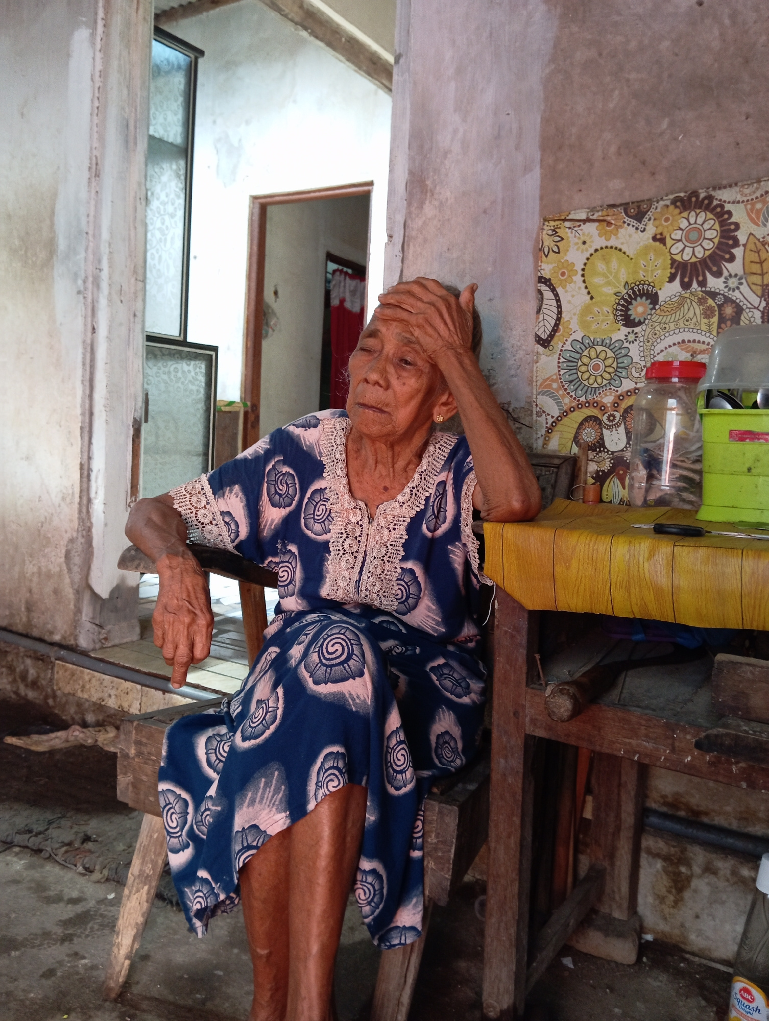 An elderly woman is seated in an indoor space in Baron, Indonesia. The woman has tan skin, deeply wrinkled, and is wearing a blue and white patterned dress with white lace trim. She is resting her for…read more