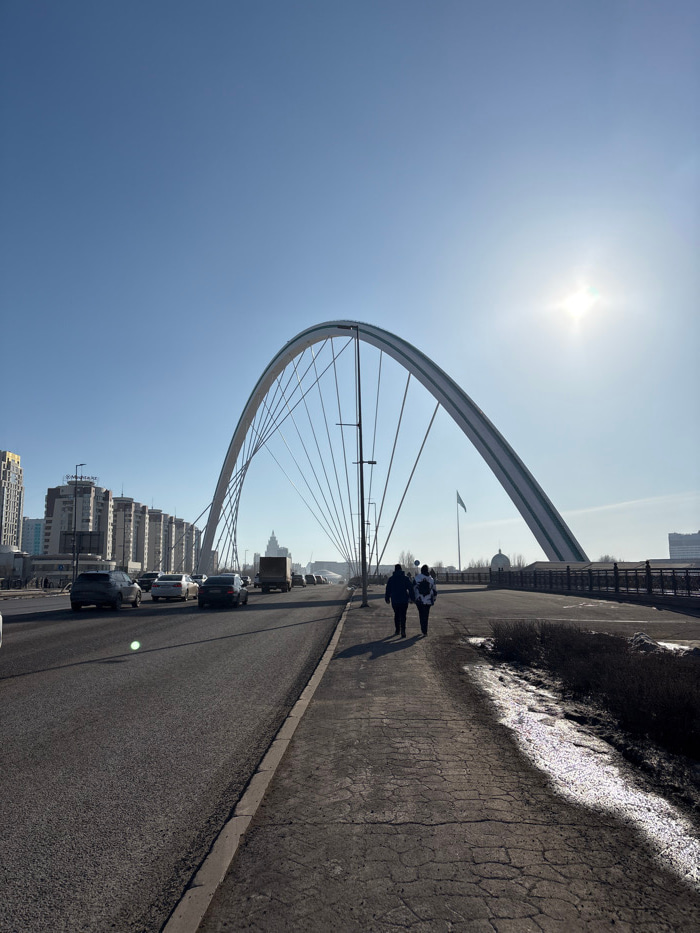 An elevated view captures the Atyrau Bridge (Fish Bridge) in Astana, Kazakhstan, crossing the Ishim River, under a clear blue sky with a visible sunburst in the upper right. The central feature is a l…read more