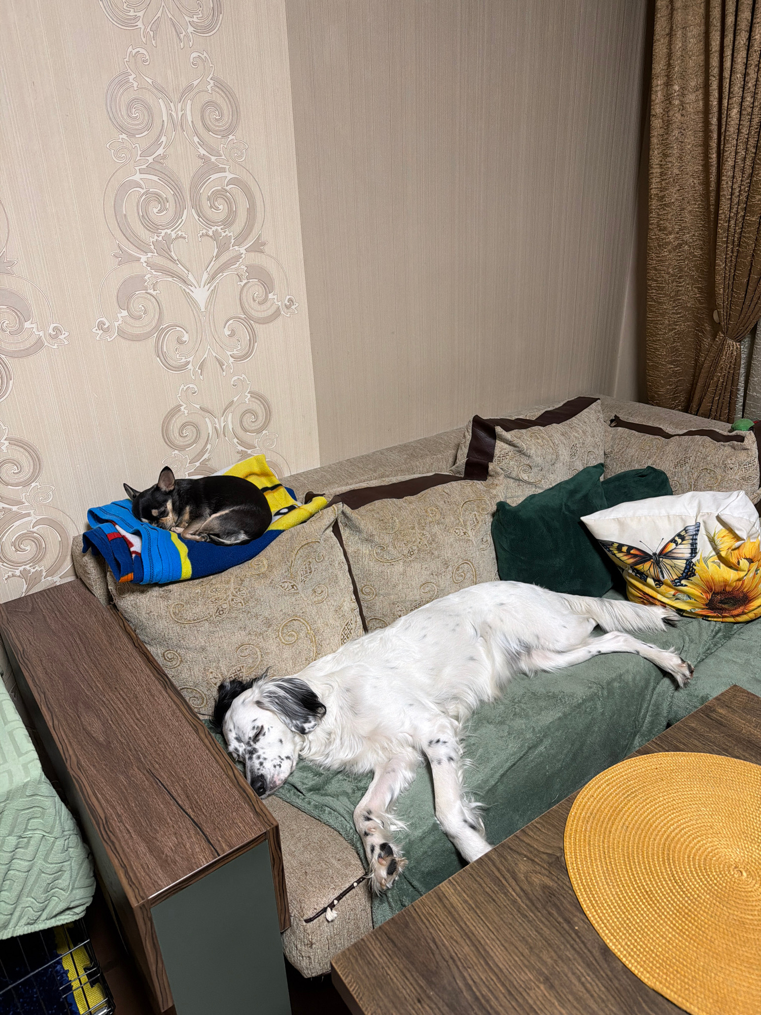 The image shows an indoor scene, likely in a residential setting. A dog, white with black spots, is lying stretched out on a couch with its head near the edge. Beside it, a small, black dog is curled…read more