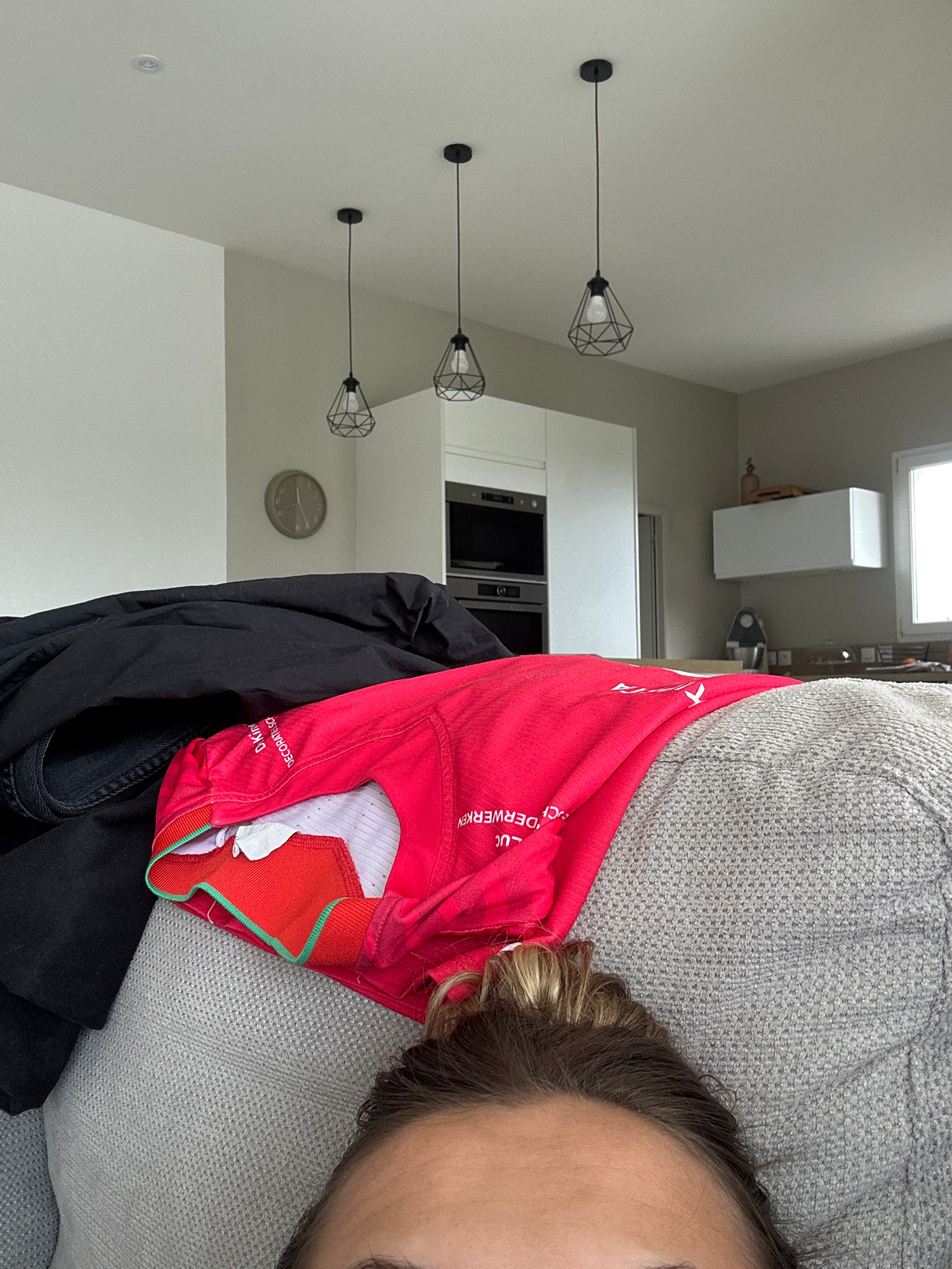 A distorted, rotated indoor scene shows a partial view of a person's face, blond hair, and a light gray textured sofa. A red and orange cycling jersey lies partially draped over the sofa and a black j…read more