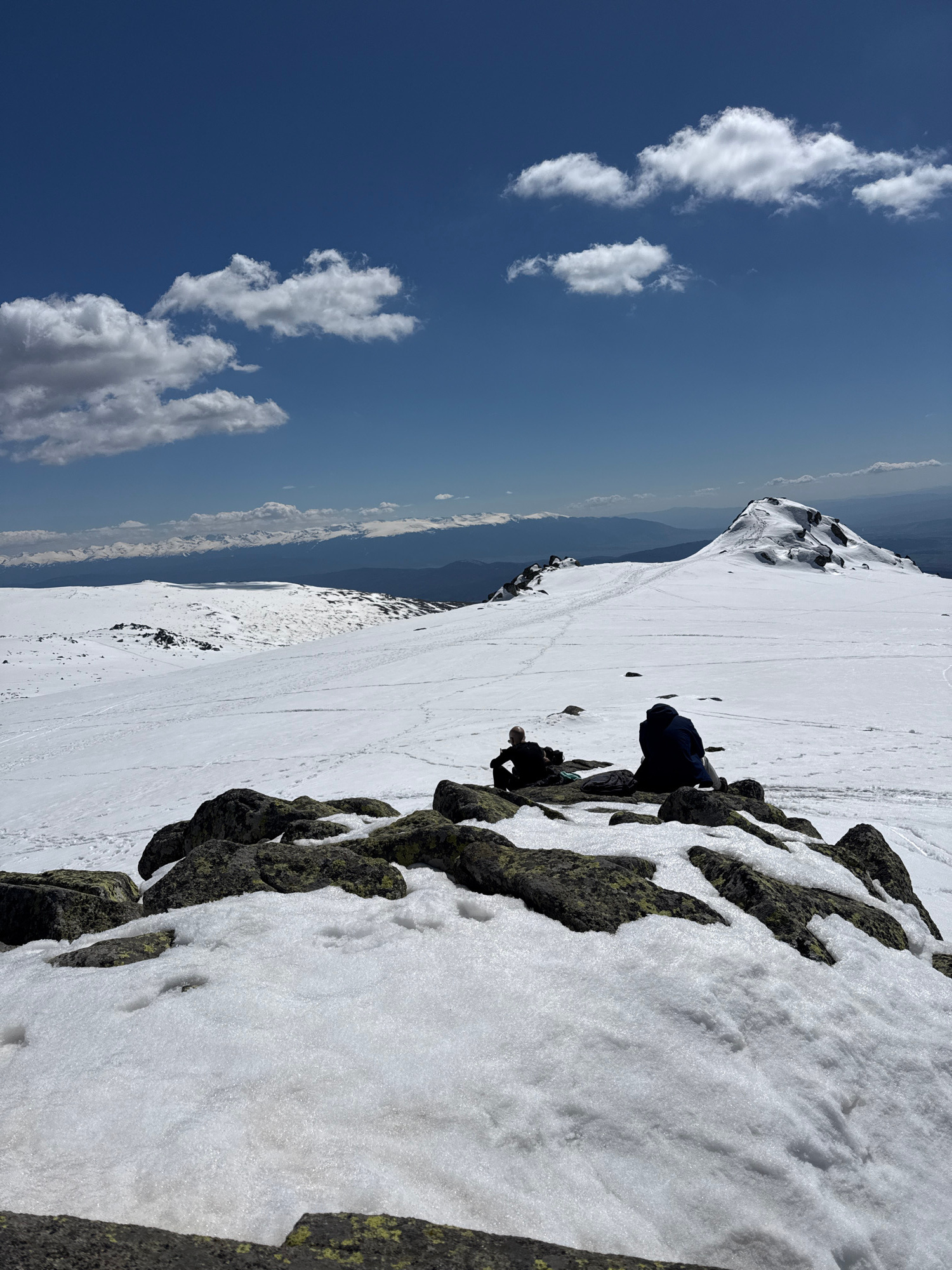 The image shows a snow-covered mountain landscape under a blue sky with scattered white clouds. Two individuals are visible on the snowy terrain, near a rocky outcrop. The overall impression is a high…read more
