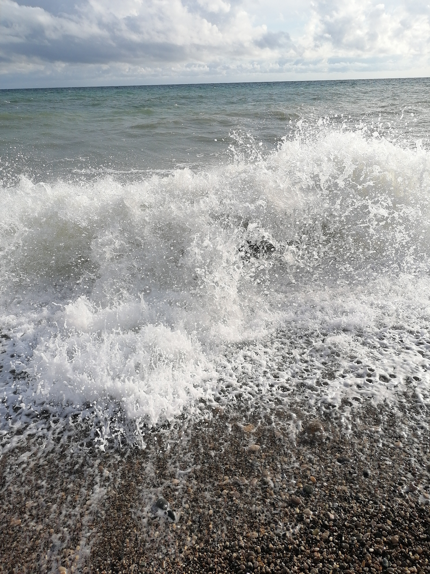 The image depicts a wave crashing onto a pebble beach in New Athos, Abkhazia. The wave is large and frothy, with numerous droplets of water suspended in the air. The beach is covered in small, rounded…read more