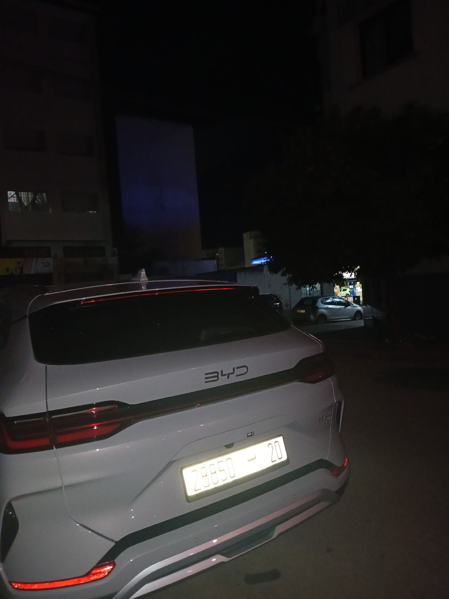 The image captures a street scene at night in Meknes, Morocco. The primary focus is the rear of a white BYD electric vehicle parked on the side of the road. The license plate is visible, bearing the n…read more