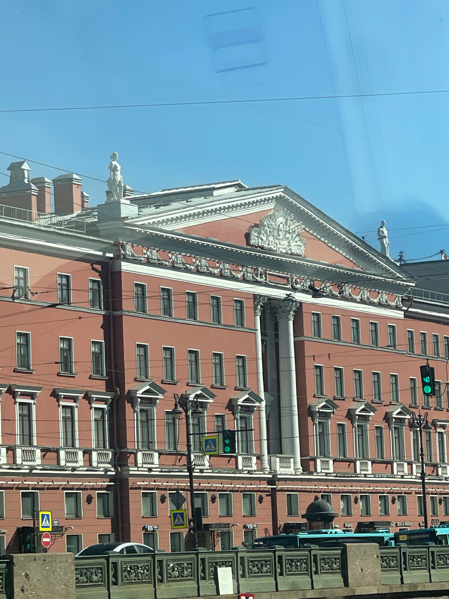 The image shows the exterior of a salmon-colored building with white architectural details, including statues and decorative elements on the facade. Windows with individual air conditioning units are…read more
