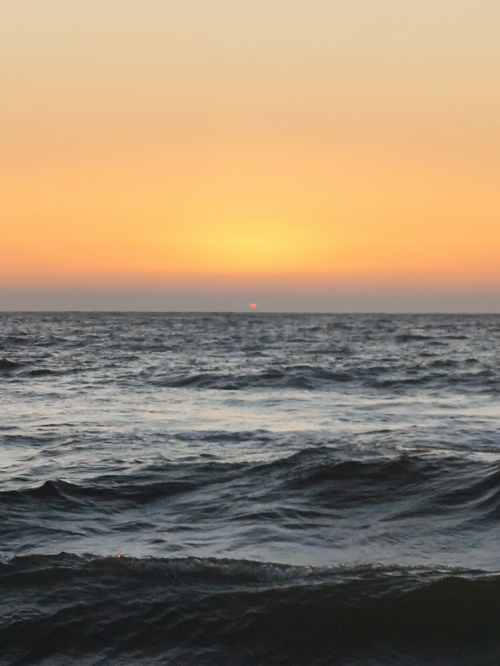 This image presents a seascape captured at sunset or sunrise in Querim, India. The upper third of the frame shows a gradient sky, transitioning from a light yellow-orange at the top to a more saturate…read more
