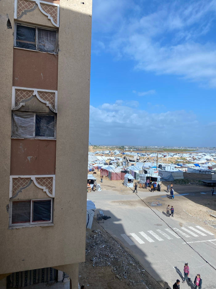 An elevated, high-angle view captures a scene in Khan Yunis, Palestinian Territory. The left side of the frame is dominated by a segment of a multi-story building, constructed with light tan stucco an…read more
