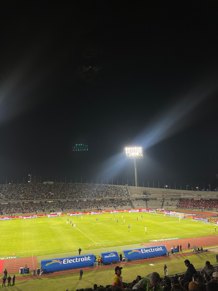 This image captures a nighttime soccer (football) match in progress at the Estadio Olímpico Universitario, located in the Coyoacán borough of Mexico City, Mexico. The scene is dominated by the brightly illuminated green grass pitch at the center, surrounded by a reddish-brown running track. Beyond the track, the multi-tiered concrete stands are largely filled with thousands of spectators; a dense concentration wearing yellow and gold attire is visible on the left side, with a smaller section of maroon and red attire on the far right. Approximately 22 players are visible on the field, wearing light-colored (white/light blue) and dark blue uniforms, actively engaged in the game. Two goalposts are discernible at opposite ends of the pitch. Along the perimeter of the field, just beyond the running track, are LED advertising boards displaying various sponsors, including "Electrolit" and "caliente.mx," with "PUMAS" also visible. Covered team benches, also branded with "Electrolit," are positioned near the sidelines. Several individuals in dark clothing, likely staff or security, stand near the track. The dark night sky overhead is lit by powerful beams from multiple stadium floodlight towers, one prominently featured on the right side. High above the stands, a grid of green pixelated lights, likely part of a large scoreboard or screen, is visible. The foreground shows the heads and upper bodies of several spectators, seated in the lower tiers, observing the game. A faint, possibly partial, moon is visible high in the dark sky, along with what appears to be a small aerial object. | Open Wire