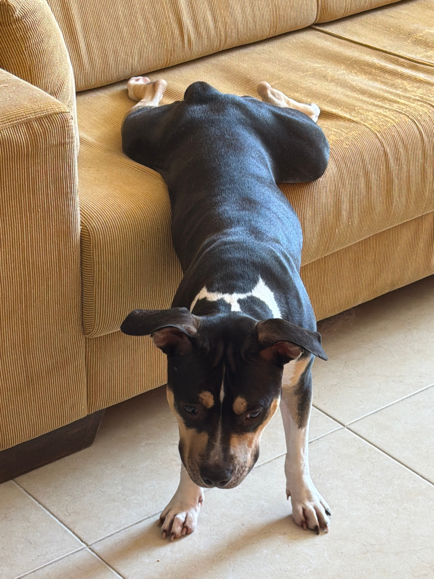 A dog with a black and brown coat with white markings is lying on a striped tan couch and extending its white paws onto the light beige tiled floor. The dog's body is mostly on the couch, while its fr…read more
