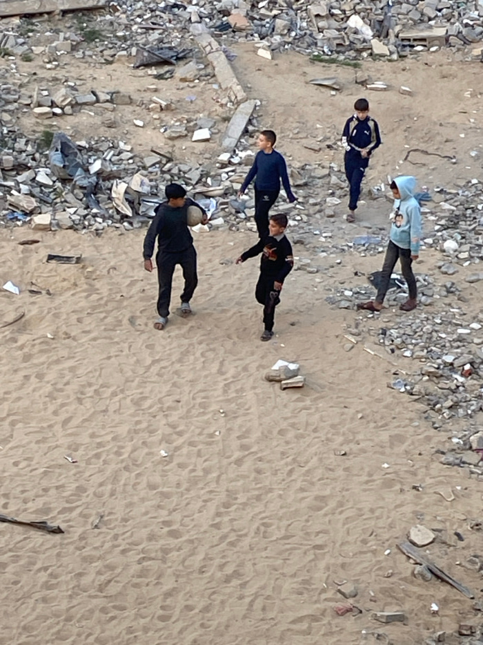 The image presents an aerial or high-angle view of five young individuals standing on a sandy area, which borders a vast expanse of debris and rubble. The scene suggests a desolate environment, possib…read more