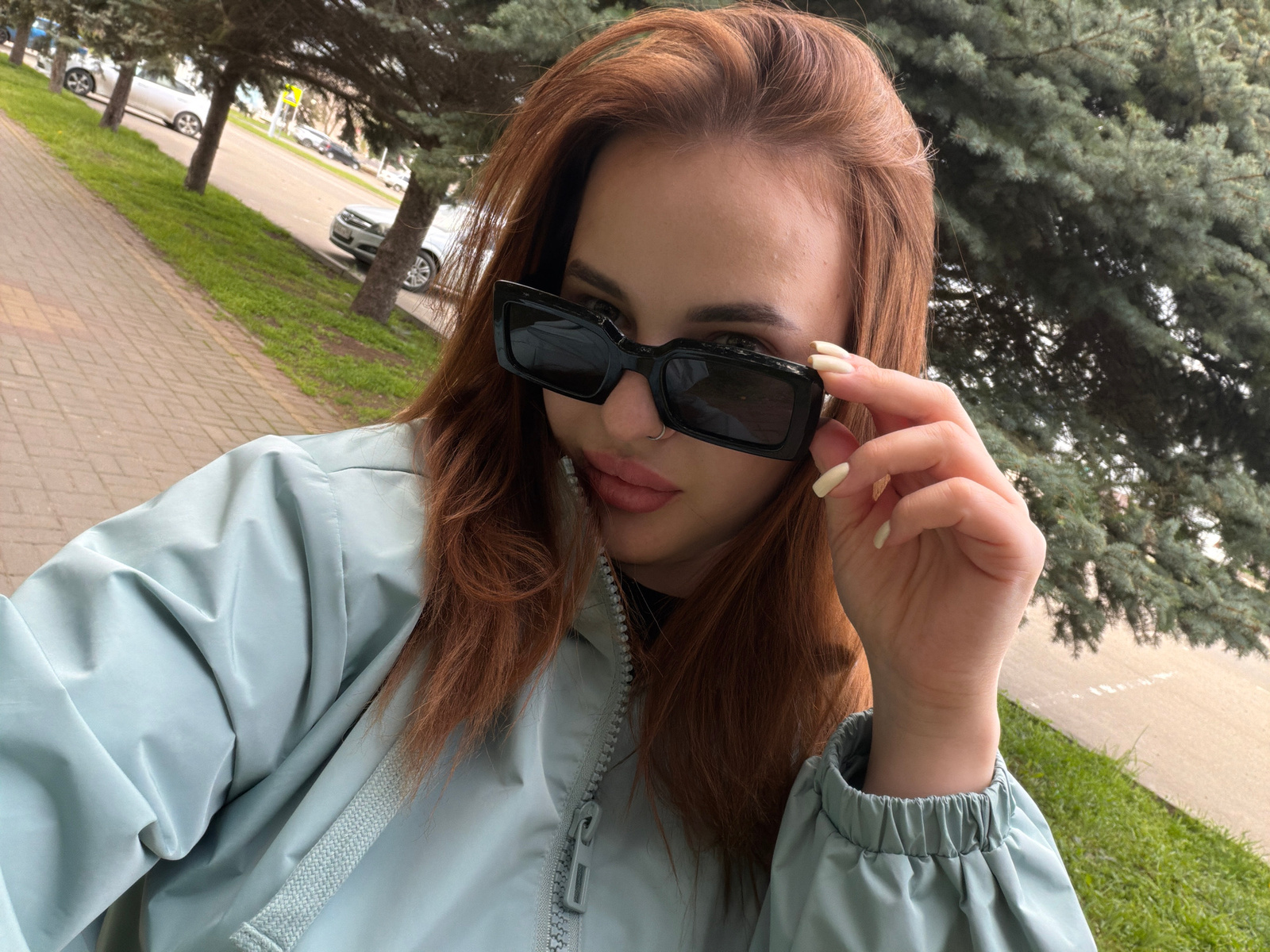 A young woman with long, auburn hair is the central figure. She is wearing a light blue jacket and square black sunglasses, which she is adjusting with her right hand. A nose ring is visible. The bac…read more