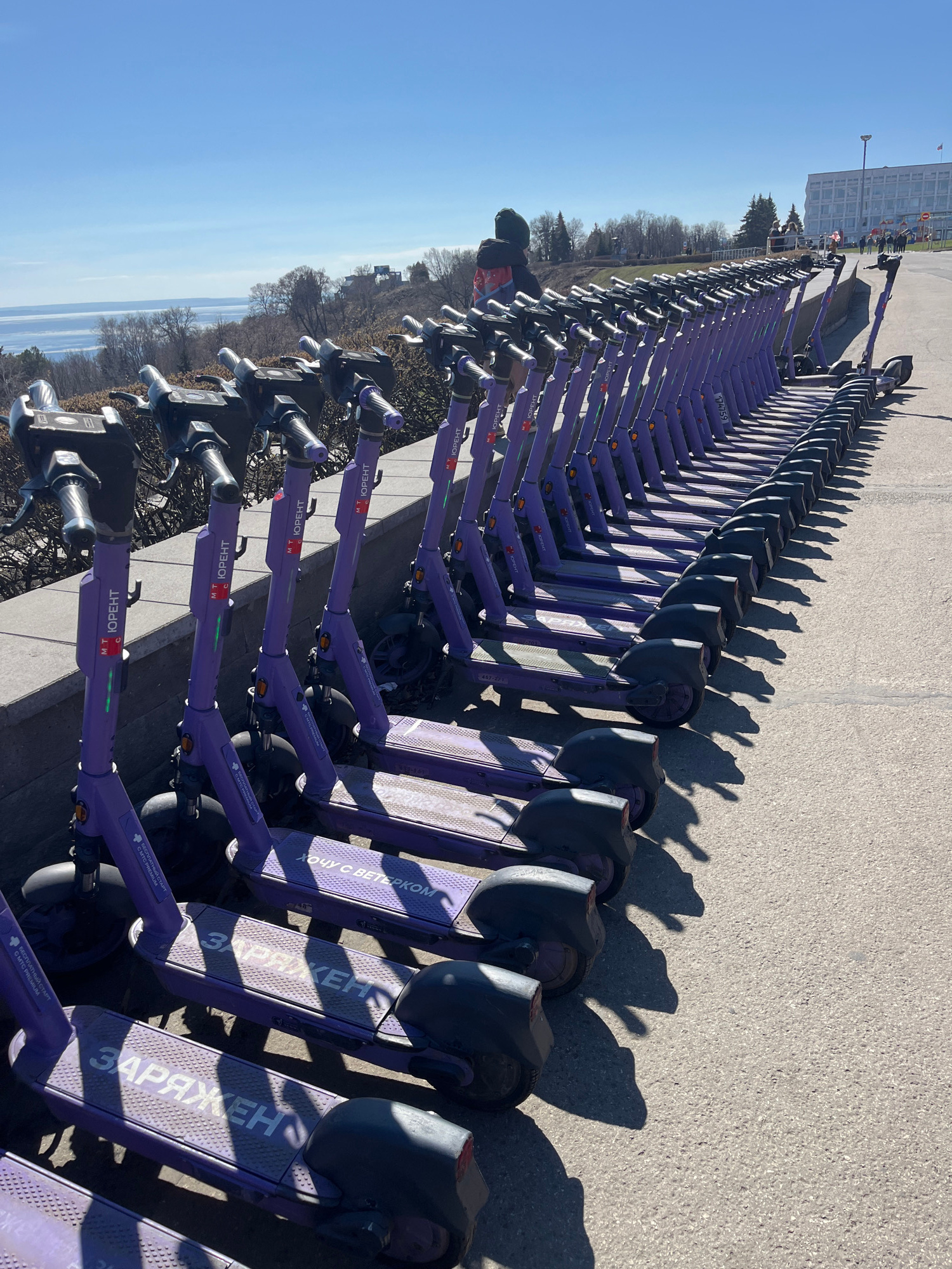 A long row of purple "Urent" rental scooters are parked on a paved surface in Ulyanovsk, Russia. The scooters are closely aligned, creating a repeating pattern that extends into the distance. The scoo…read more