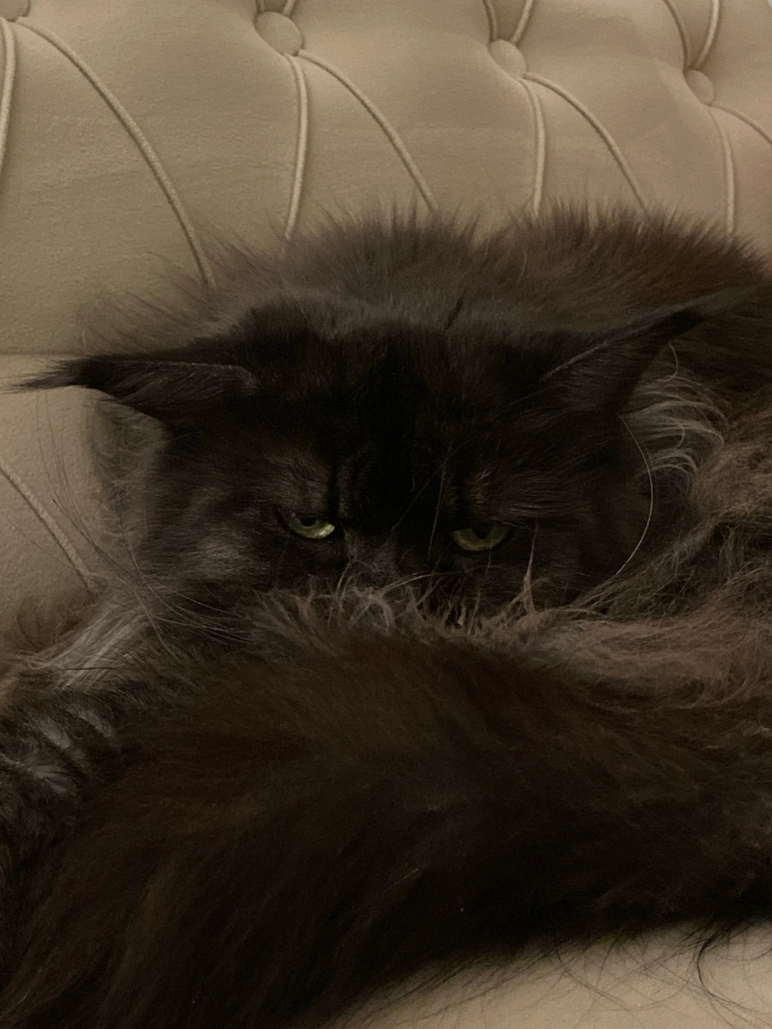 A long-haired, black cat with green eyes rests on a light beige, button-tufted cushion. The cat's face is angled towards the lower left corner of the frame. The location is not discernible from the im…read more