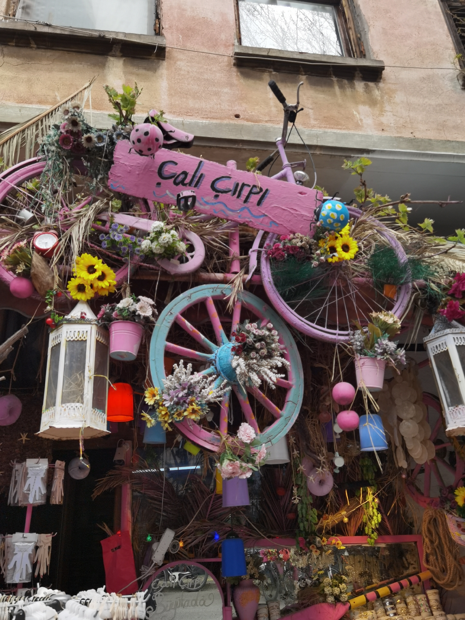 The image depicts a storefront in Buyukada, Prince Islands, Turkey, adorned with a whimsical, colorful display. A pink bicycle frame is mounted above the shop entrance, with its wheels and handlebars…read more