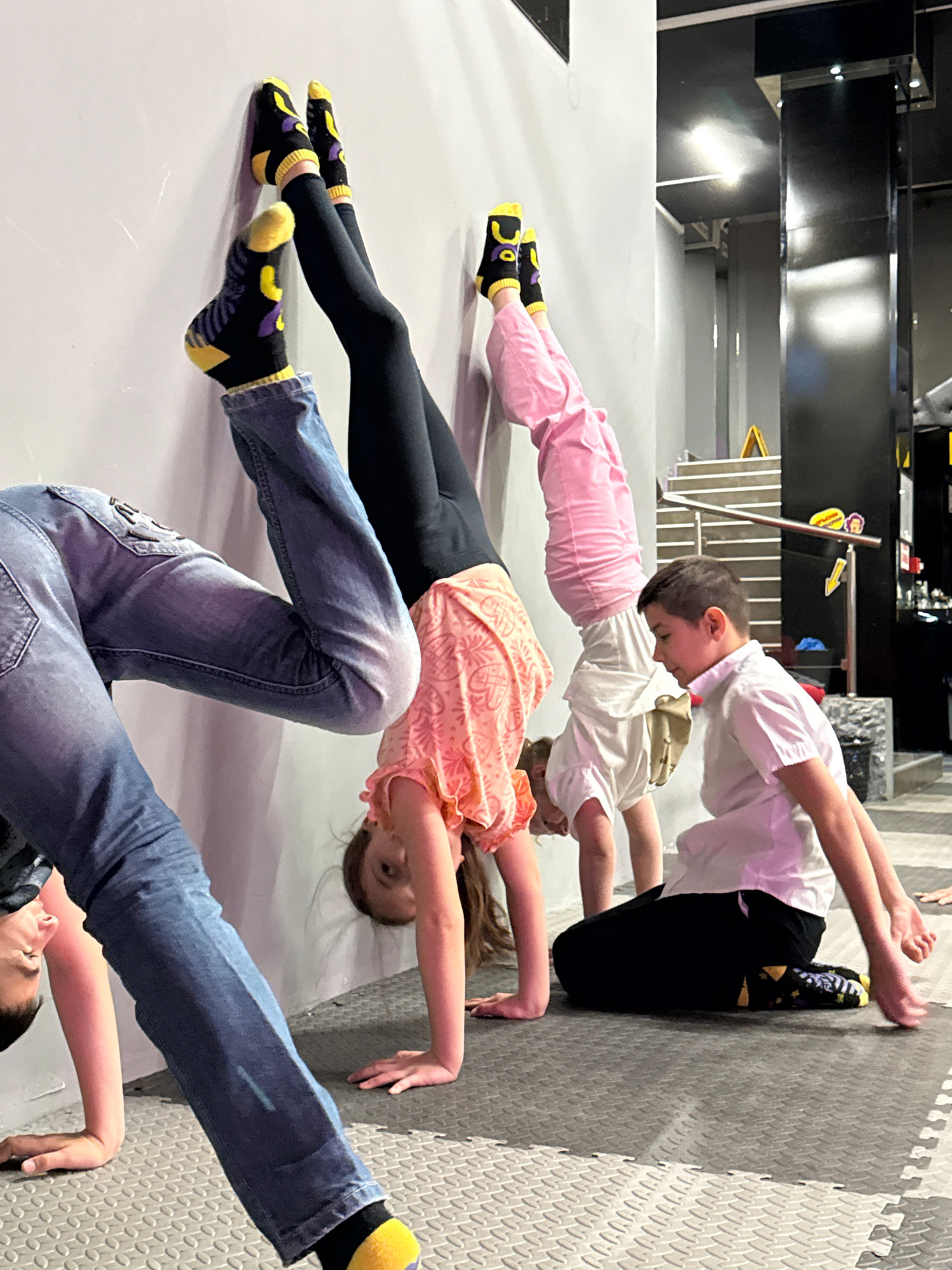 Four people are performing a synchronized exercise against a wall in an indoor space. The foremost person is wearing blue jeans and a black top, while the next person is wearing a peach-colored top an…read more