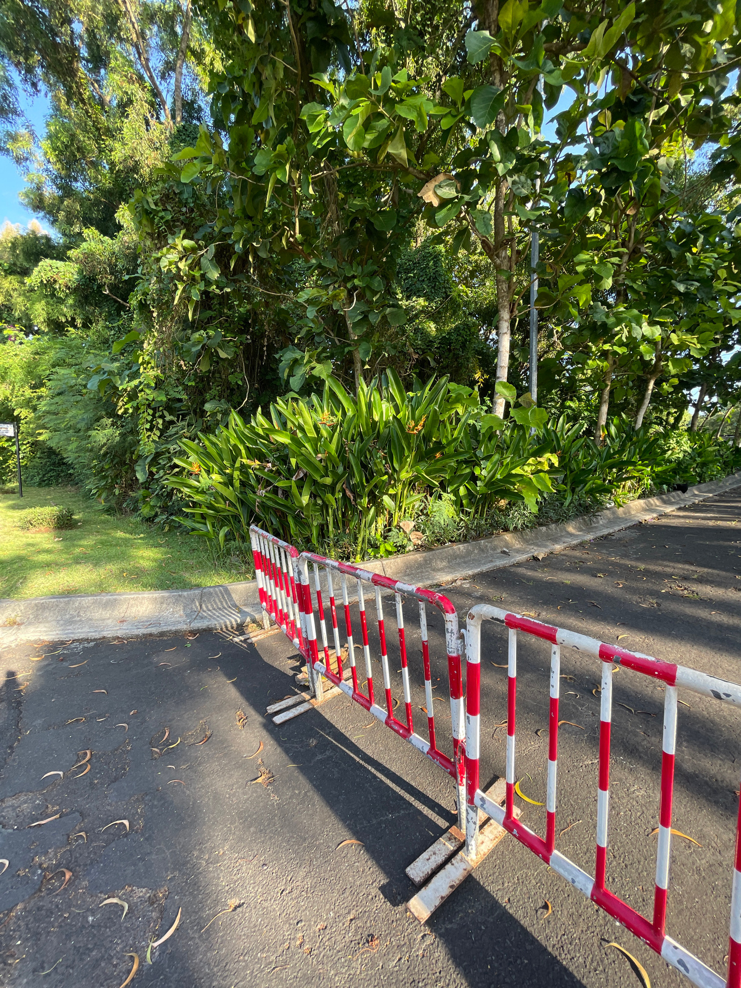 The image displays an outdoor scene in a tropical environment, likely a roadside or pathway, characterized by a stark contrast between man-made infrastructure and lush vegetation. A weathered red and…read more