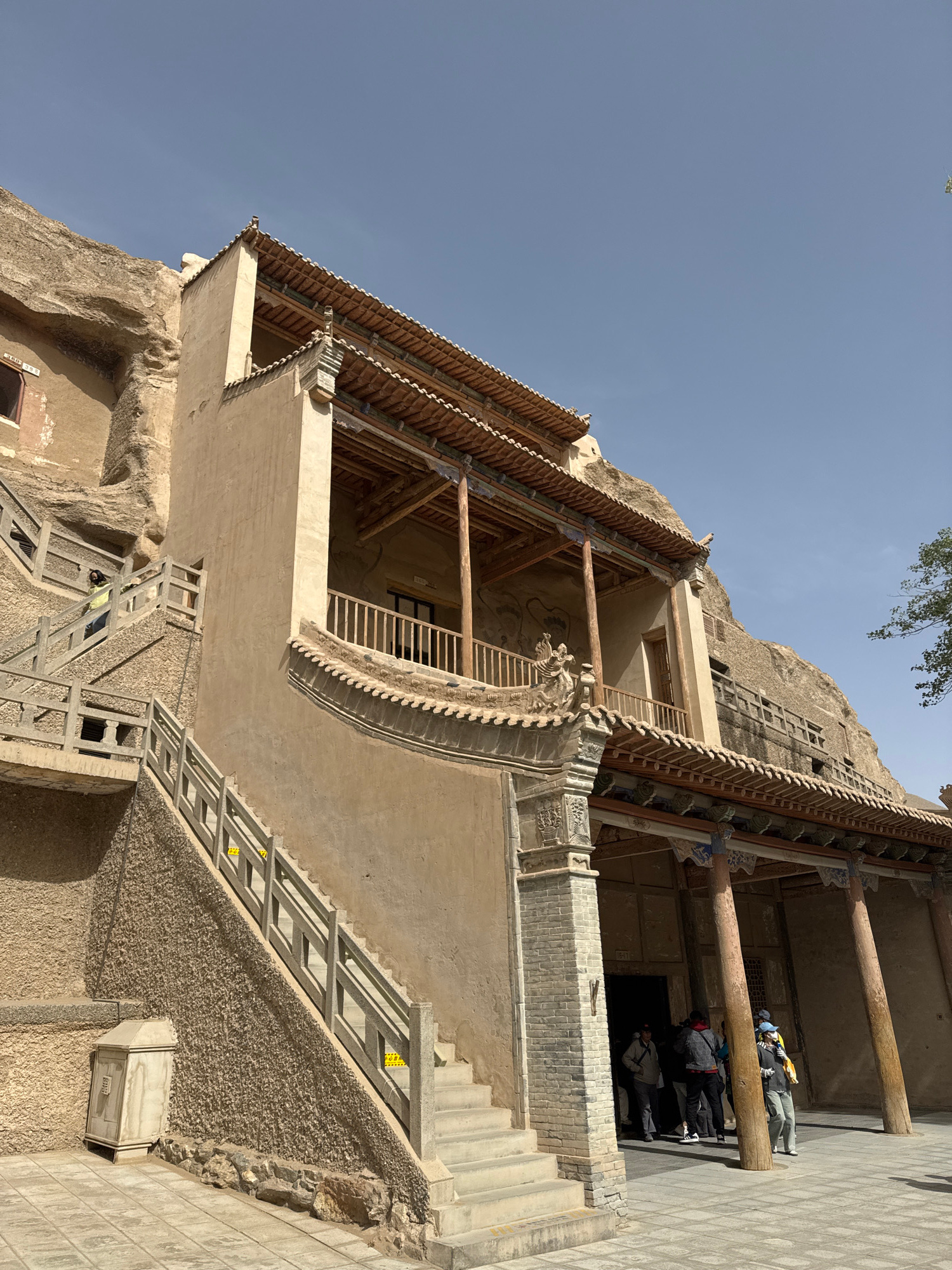 The image depicts a building at the Mogao Caves, a UNESCO World Heritage site in Dunhuang City, China. The architectural style is a blend of traditional Chinese and cave-carved elements. The building…read more