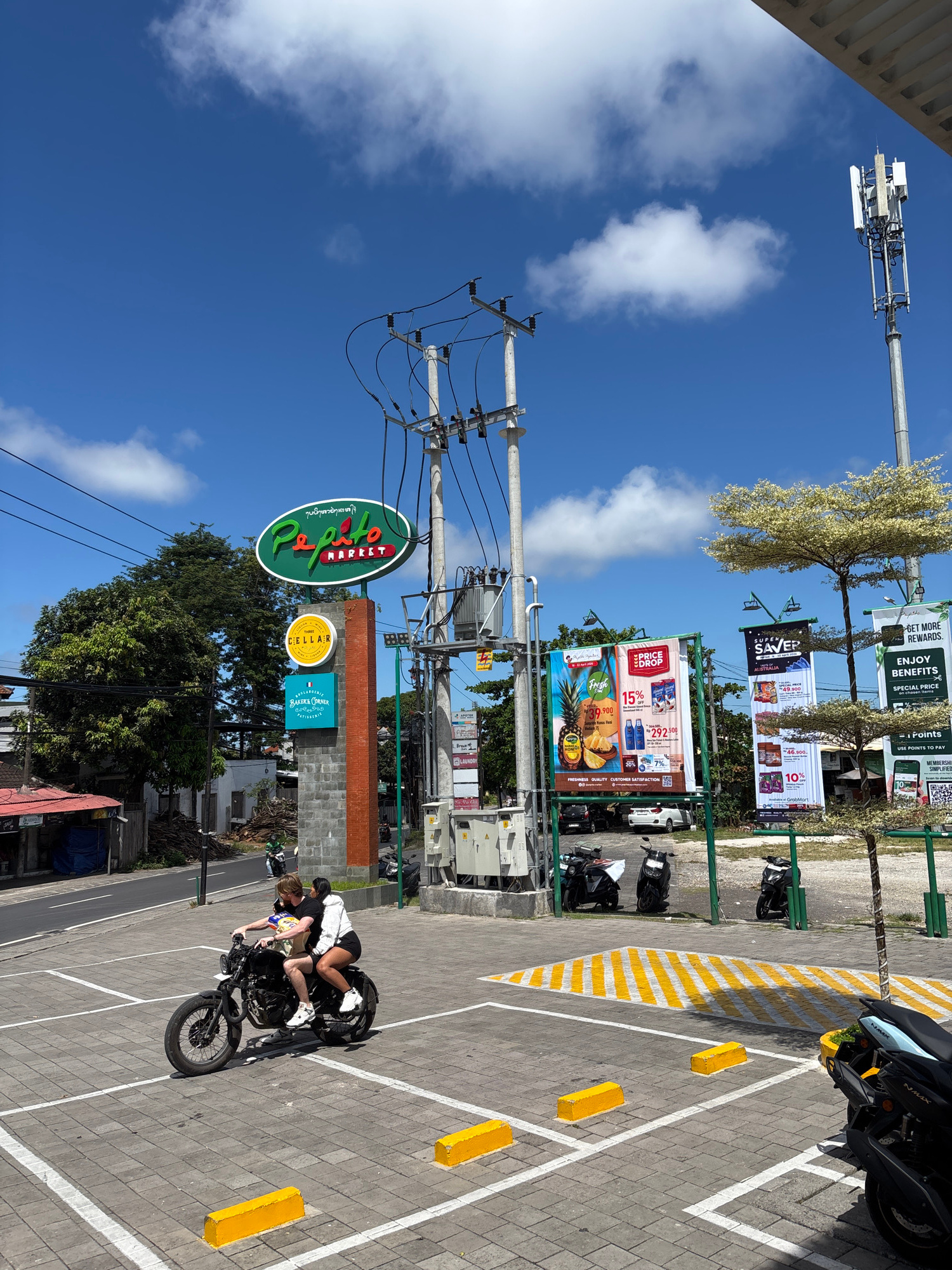 The image depicts a bustling outdoor commercial area in Kuta Selatan, Indonesia, under a bright, clear blue sky with scattered white clouds. The scene primarily features a paved parking lot made of gr…read more